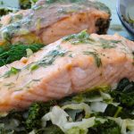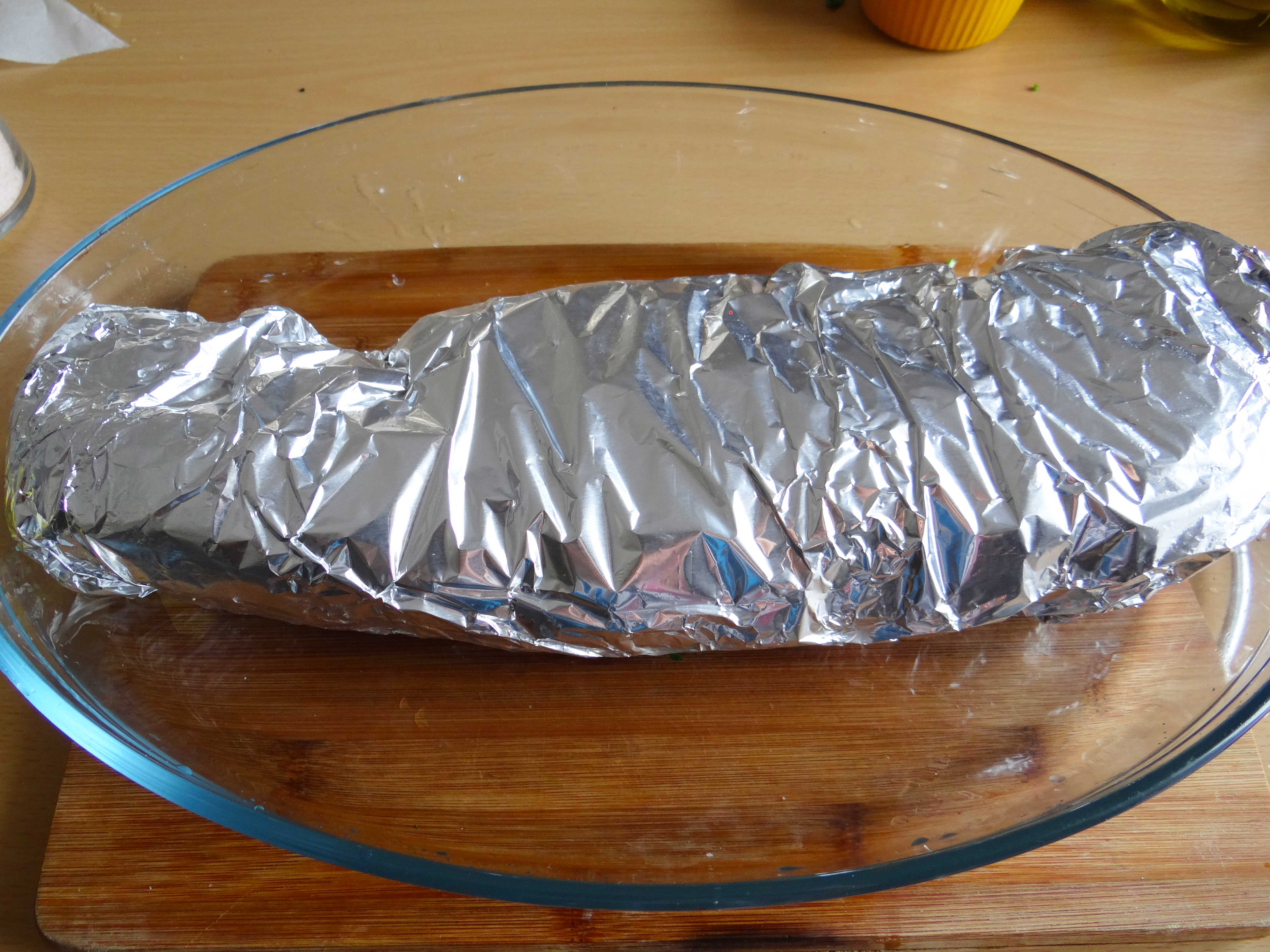 Învelim somonul cu hârtia de copt și cu folia de aluminiu, îl punem într-o tavă încăpătoare și îl dăm la cuptor pentru 40-50 de minute.