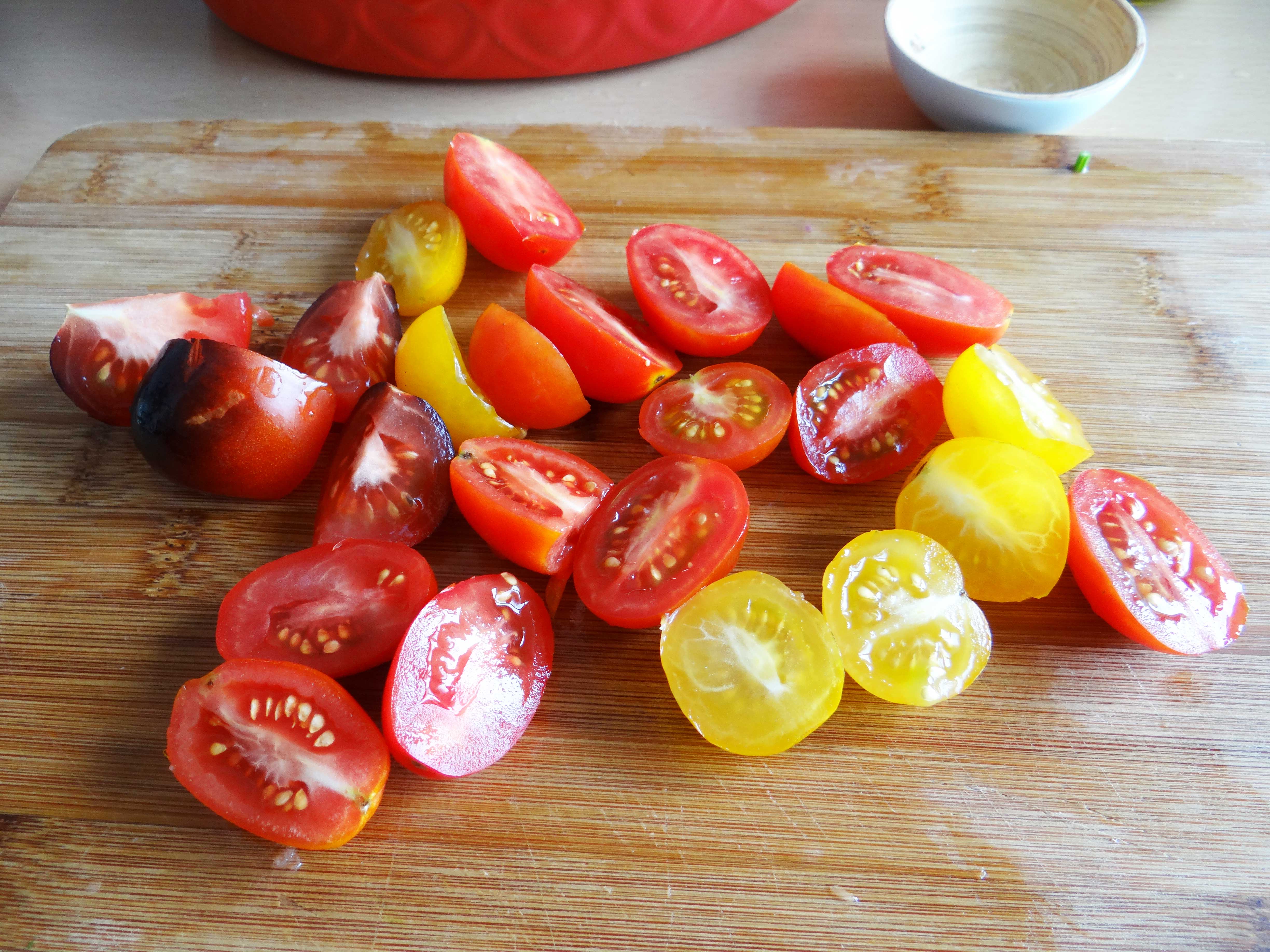 2. Tăiem roșiile în două. Curățăm și pisăm usturoiul.