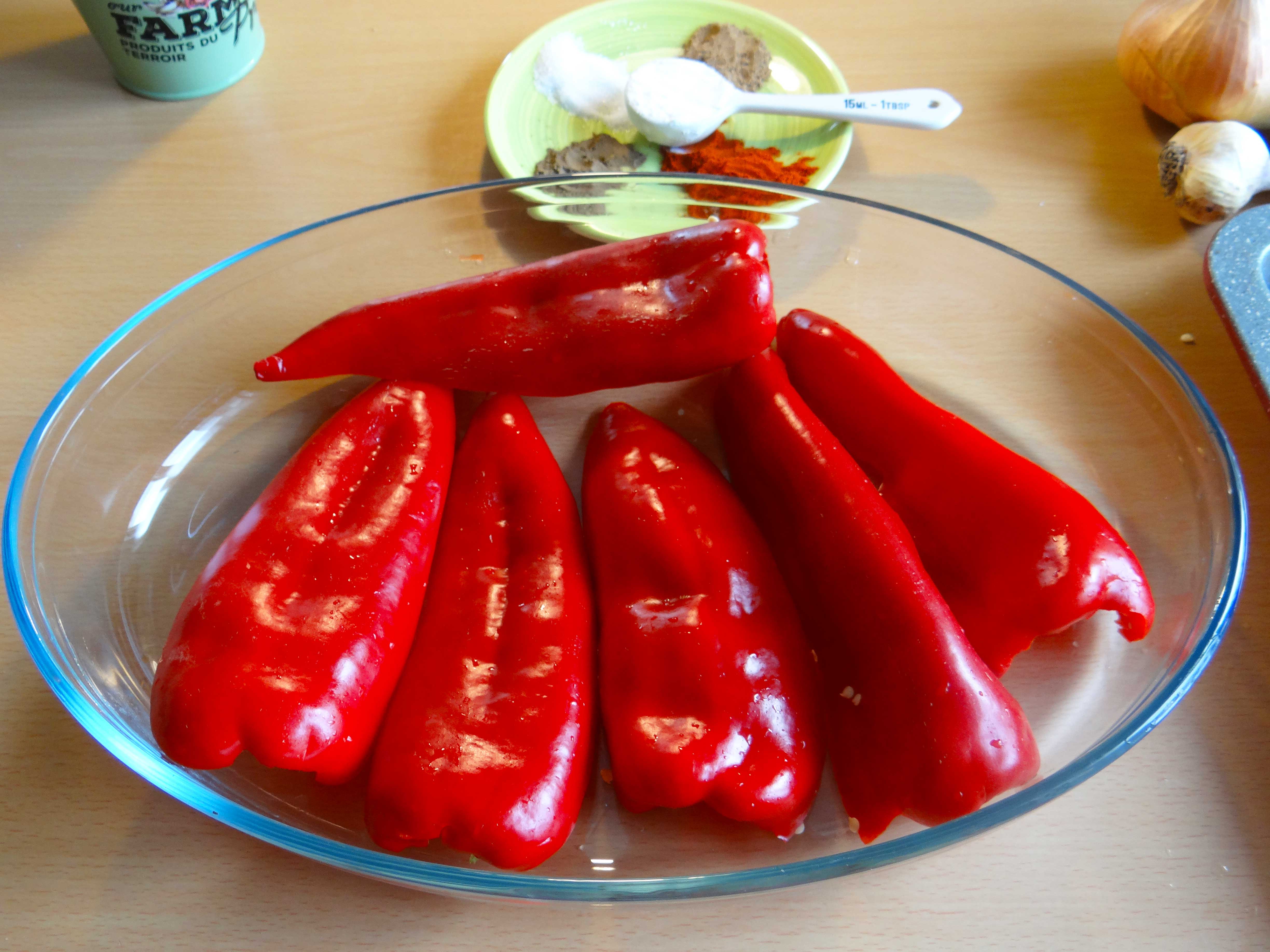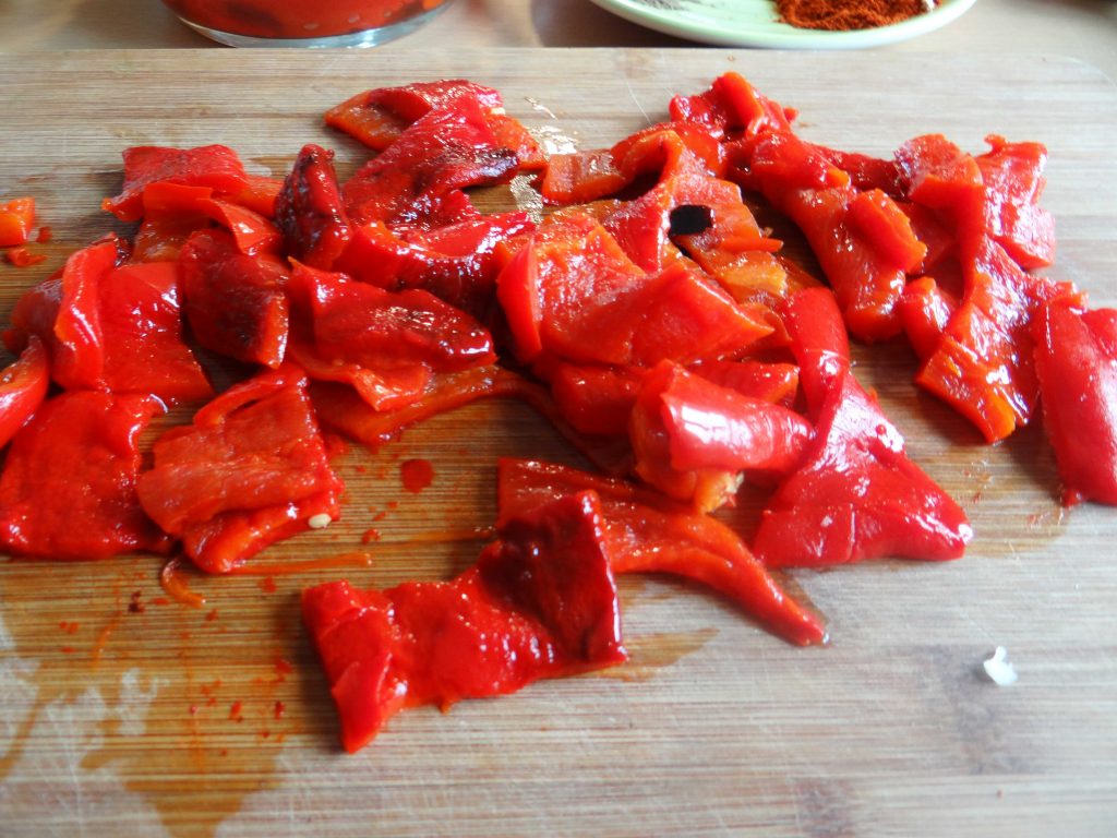 2. Taiem ardeii pe jumate, indepartam semintele si coditele. Ii asezam in tava si ii dam la cuptor pana cand se innegresc. Dar atentie sa nu-i ardeti.