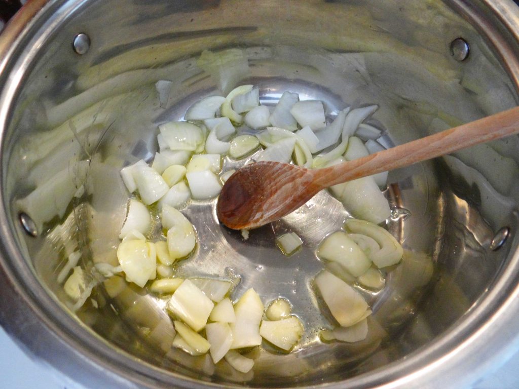 7. Intr-o oala cu fund dublu punem cele doua linguri de ulei la incins dupa care adaugam ceapa si usturoiul pe care le calim 4-5 minute la foc mediu.