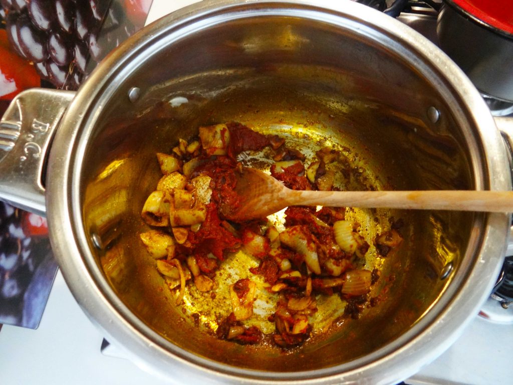 8. Cand ceapa a devenit translucida adaugam sarea, piperul, paprika, chimenul si pasta de rosii. Le calim circa 2 minute si amestecam constant.