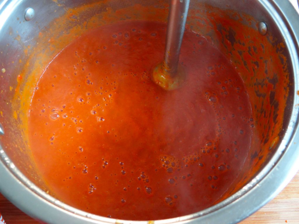 10. Dupa 15 minute luam oala de pe foc si cu ajutorul unui blender vertical pasam totul. Daca vreti sa ingrosati supa mai mult dizolvati amidonul in jumatatea de cana cu apa si apoi puneti amestecul peste supa.