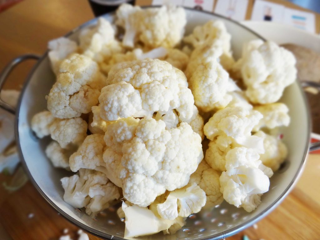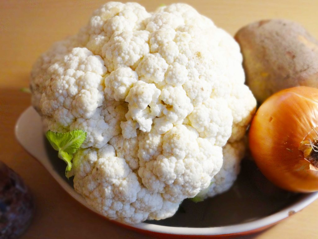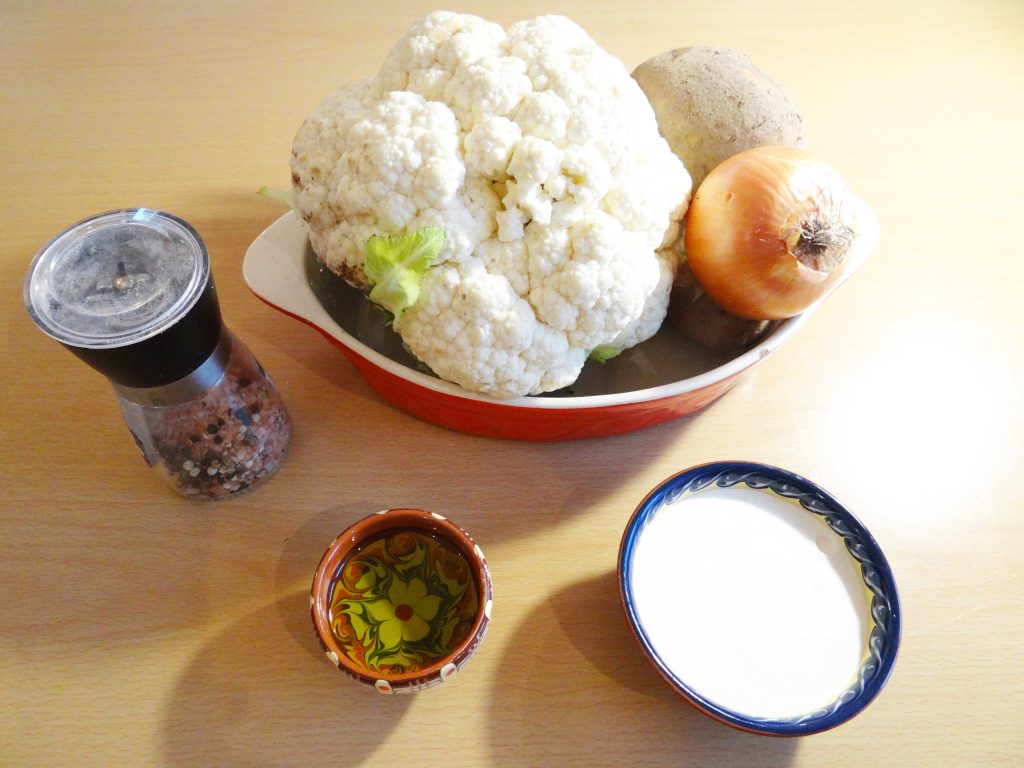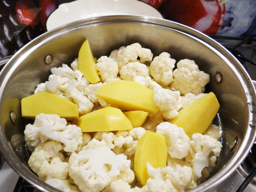 2. Tăiem conopida în buchețele mici, curațăm cartofii și apoi așezăm totul peste ceapă. Turnăm desupra apa, punem 1/4 linguriță de sare și lăsăm să fiarbă la foc mediu până când legumele se înmoaie.(oala o acoperim cu un capac)