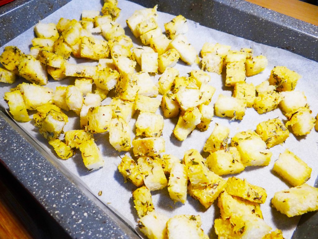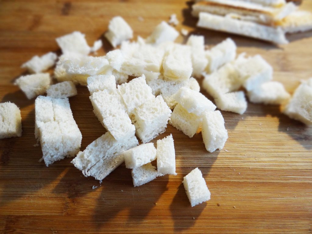 3. În timpul în care amestecul se răcește noi pregătim crutoanele. Îndepărtăm coaja și tăiem feliile în cuburi mici.