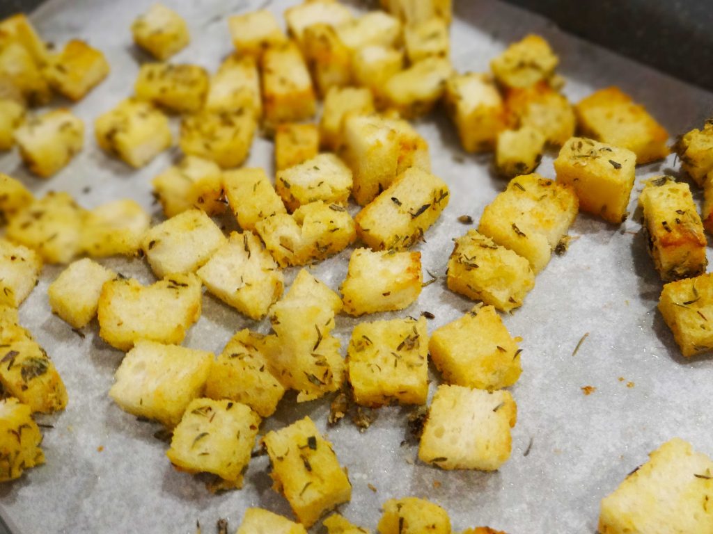 4. Așezăm crutoanele în tigaie și amestecăm bine apoi întindem crutoanele într-o tavă tapetată cu hârtie de copt.