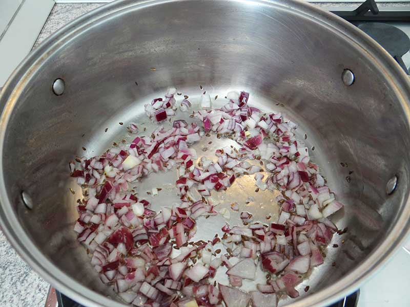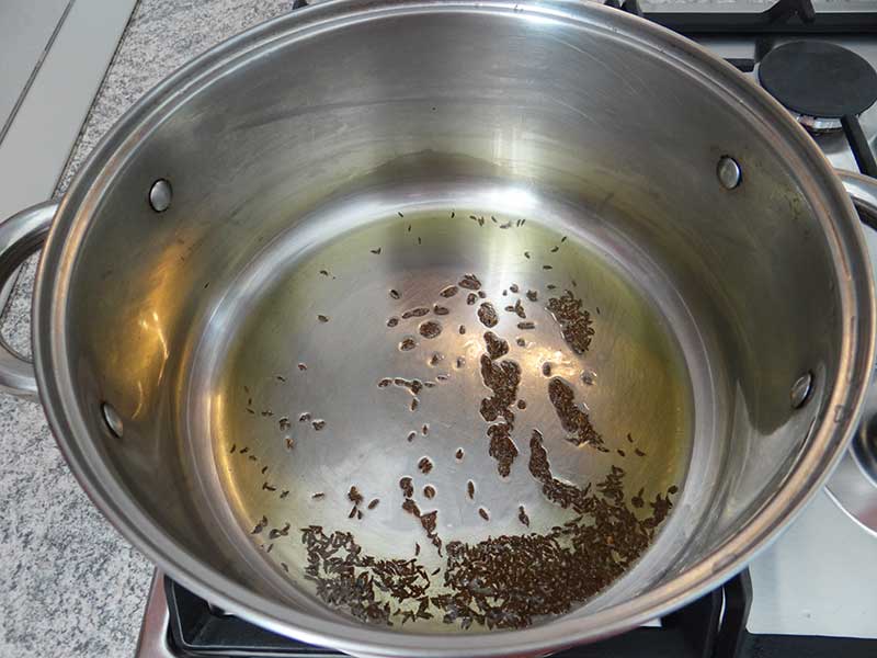 5. Punem uleiul la încins într-o oală cu fund dublu. Adăugăm semințele de chimen pe care le prăjim 1 minut.