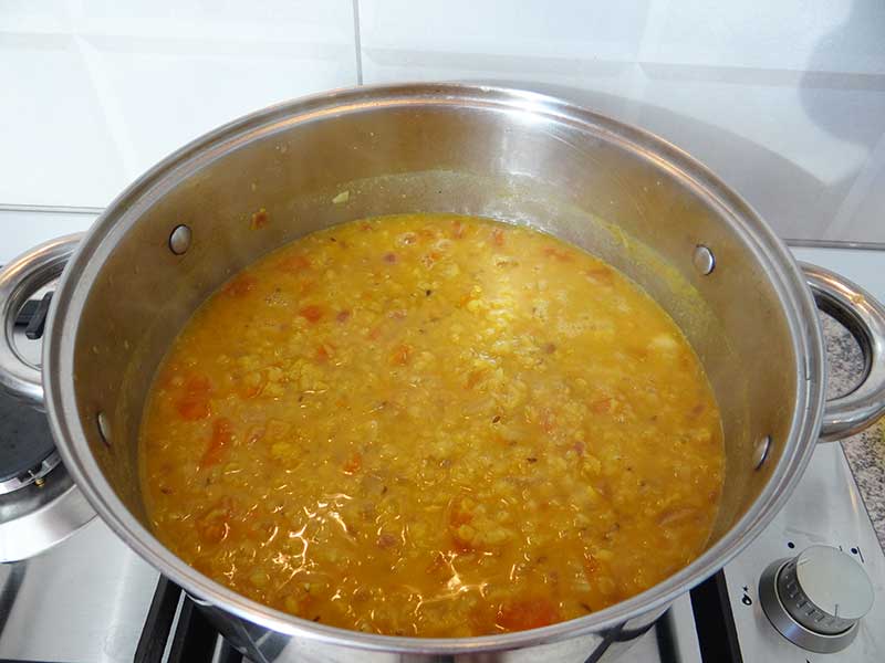8. Adăugăm lintea și apa, lăsăm totul pe foc 30 de minute. Din când în când amestecăm.