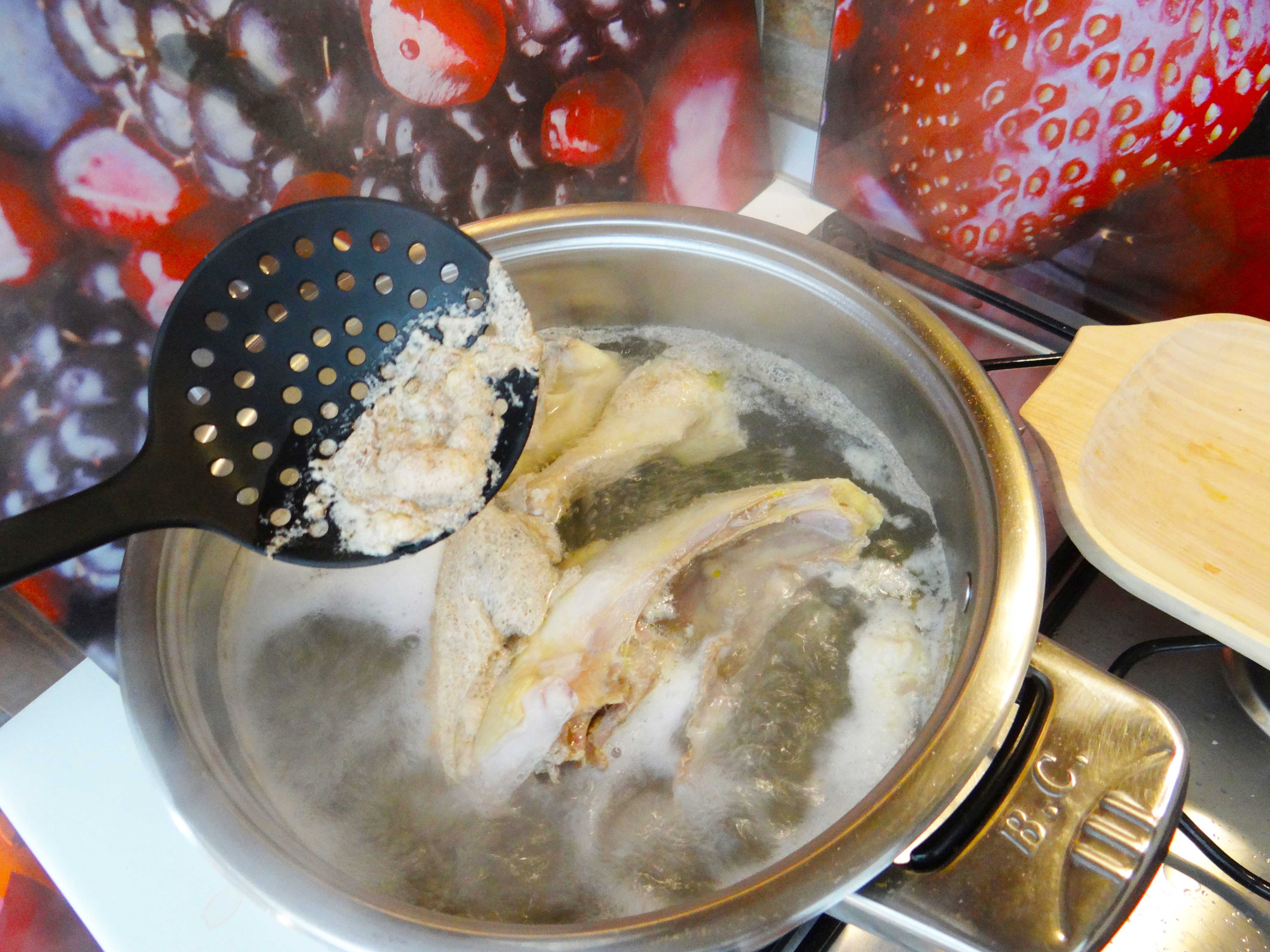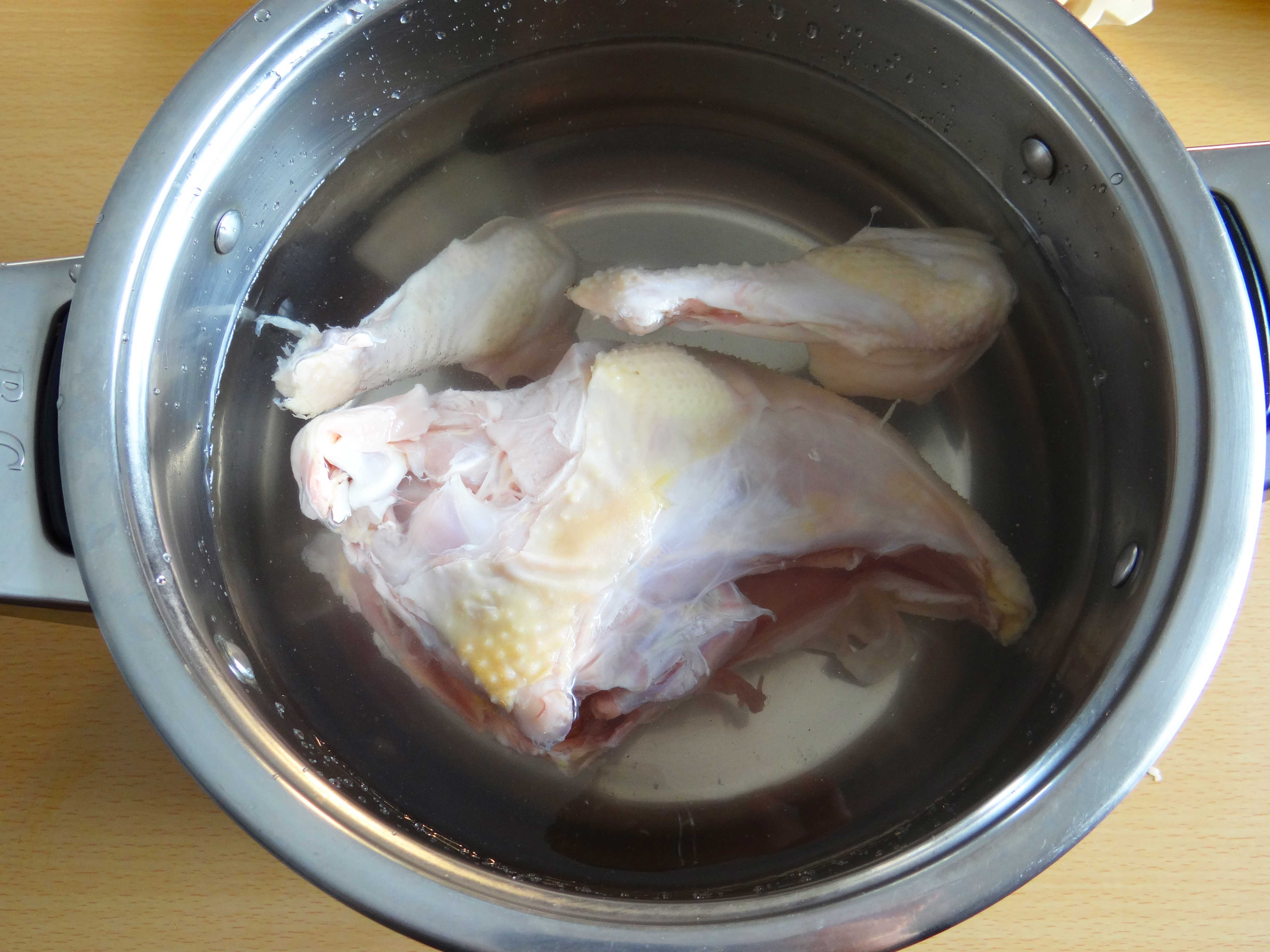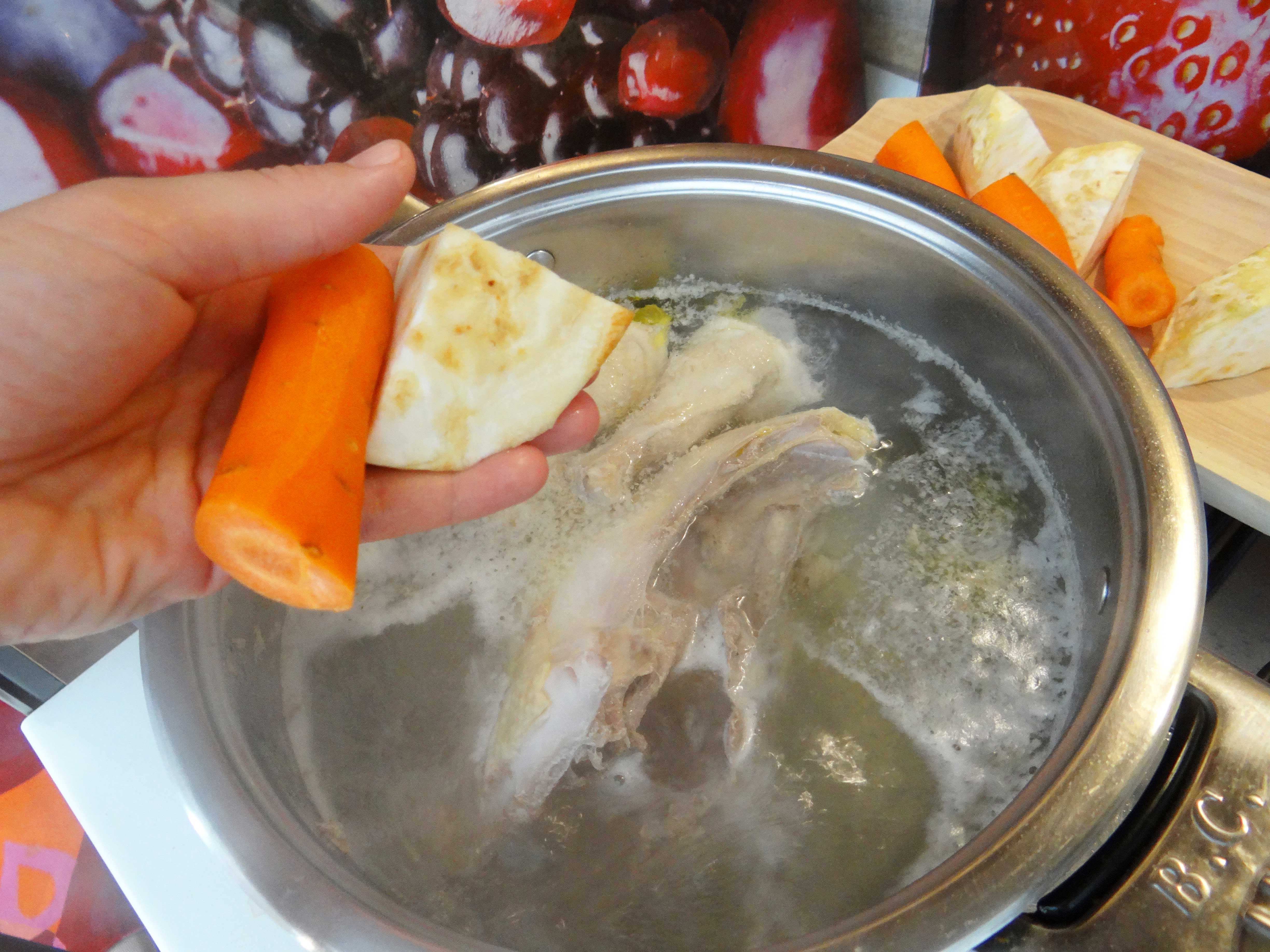 2. La supa vom folosi spatele, aripile si pieptul pe care le punem intr-o oala cu apa rece la fiert. Lasam oala neacoperita. *eu am folosit o oala de 5L.