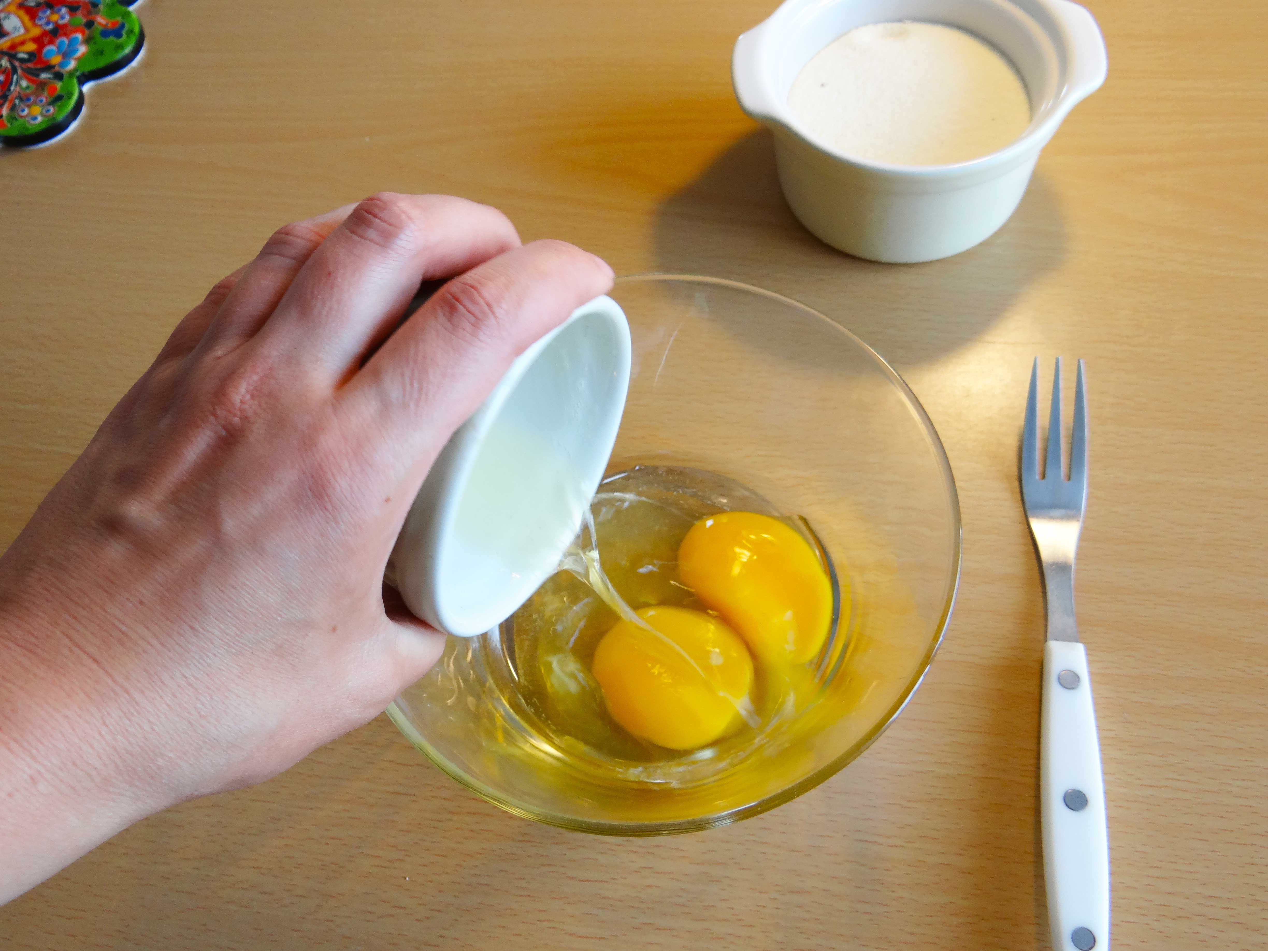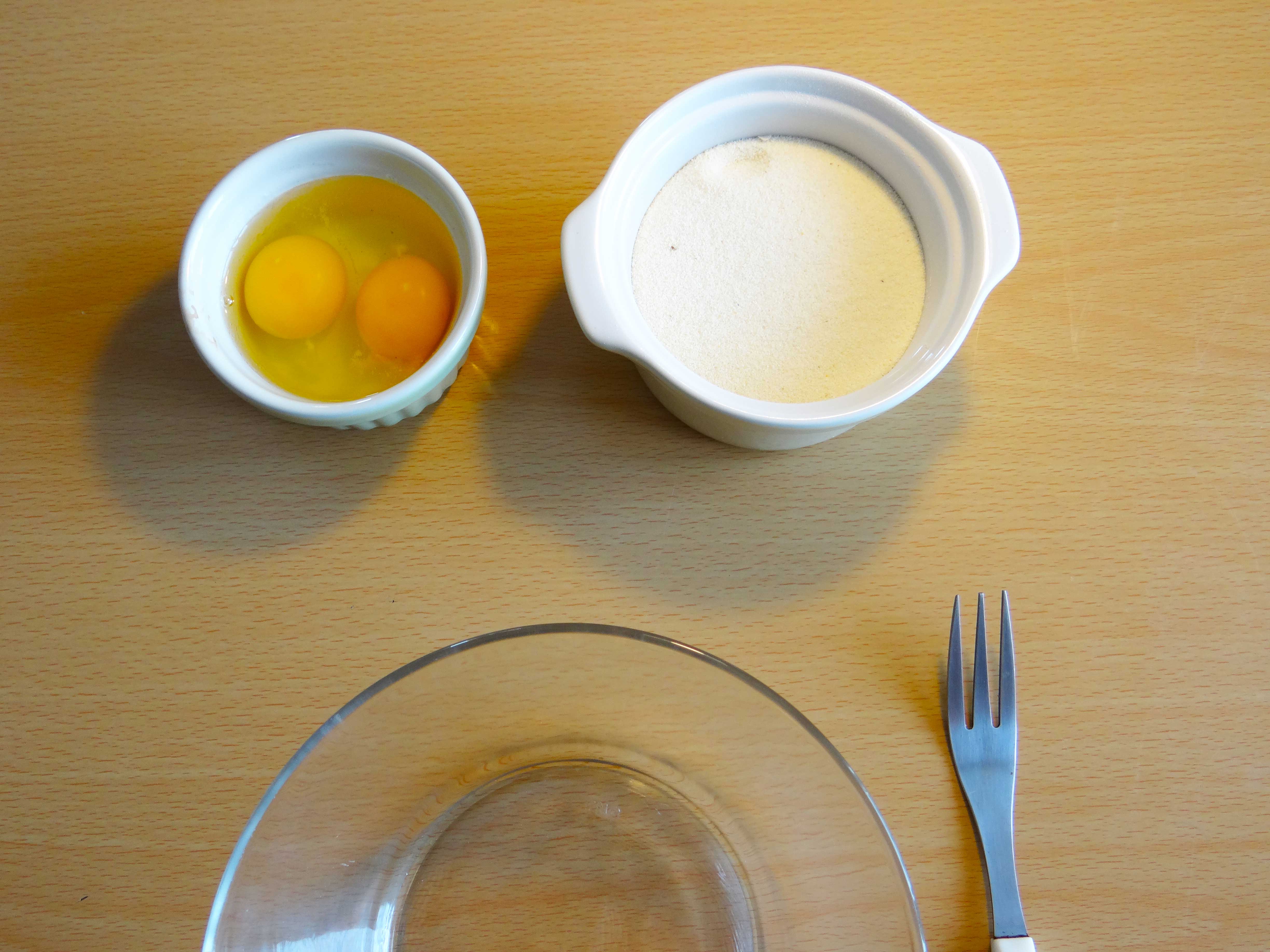 6. Cand carnea este aproape gata facem compozitia pentru galuste. Pentru aceasta avem nevoie de gris si 2 oua.
