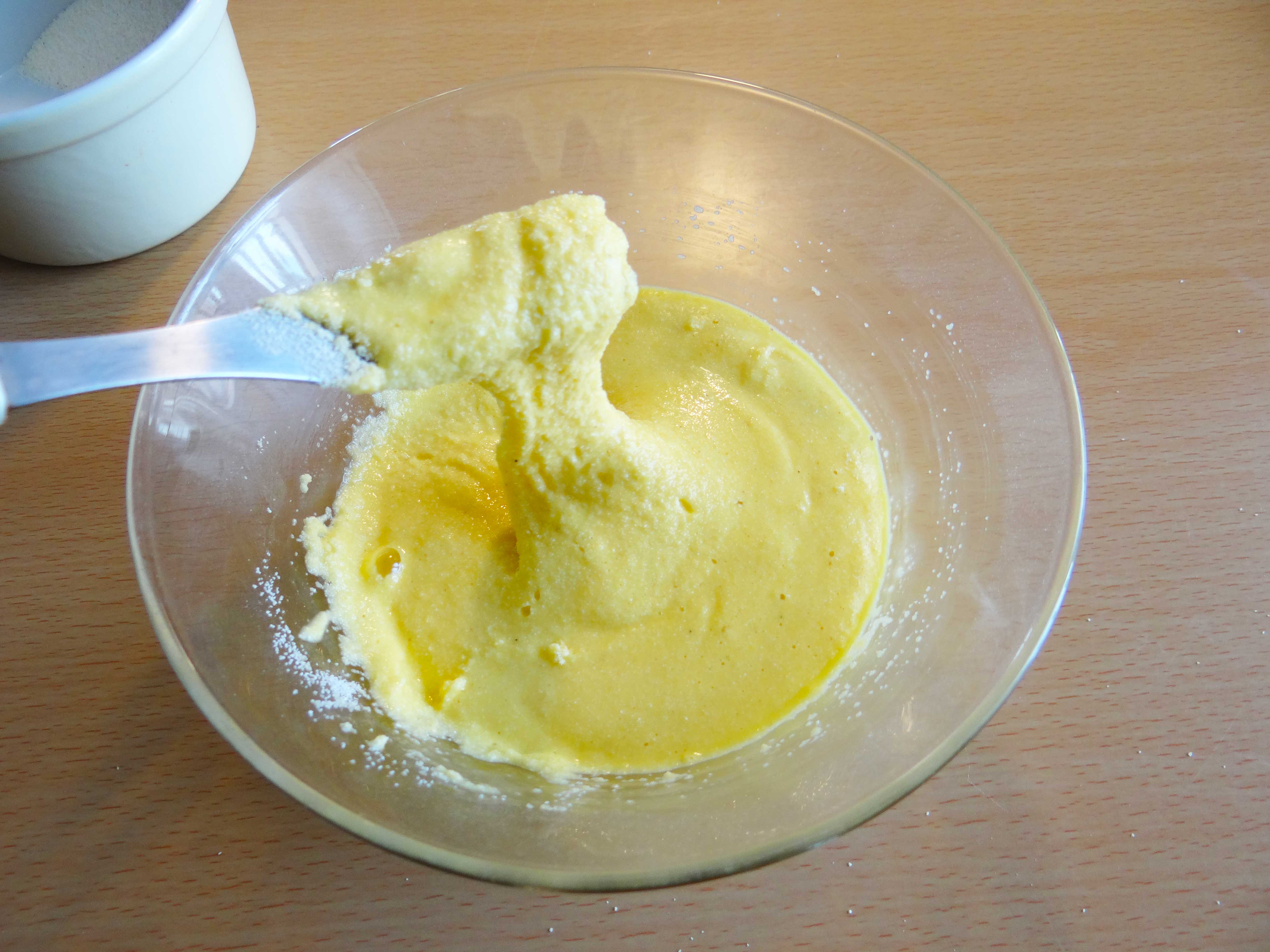 7. Punem ouale intr-un castron incapator, le batem bine cu furculita dupa care punem putin cate putin gris si amestecam bine. La final compozitia noastra trebuie sa fie groasa dar sa curga de pe furculita. Compozitia trebuie sa stea cel putin 10 minute deoarece grisul trebuie sa se hidrateze. Dupa 10 minute verificam daca mai este nevoie sau nu de gris.