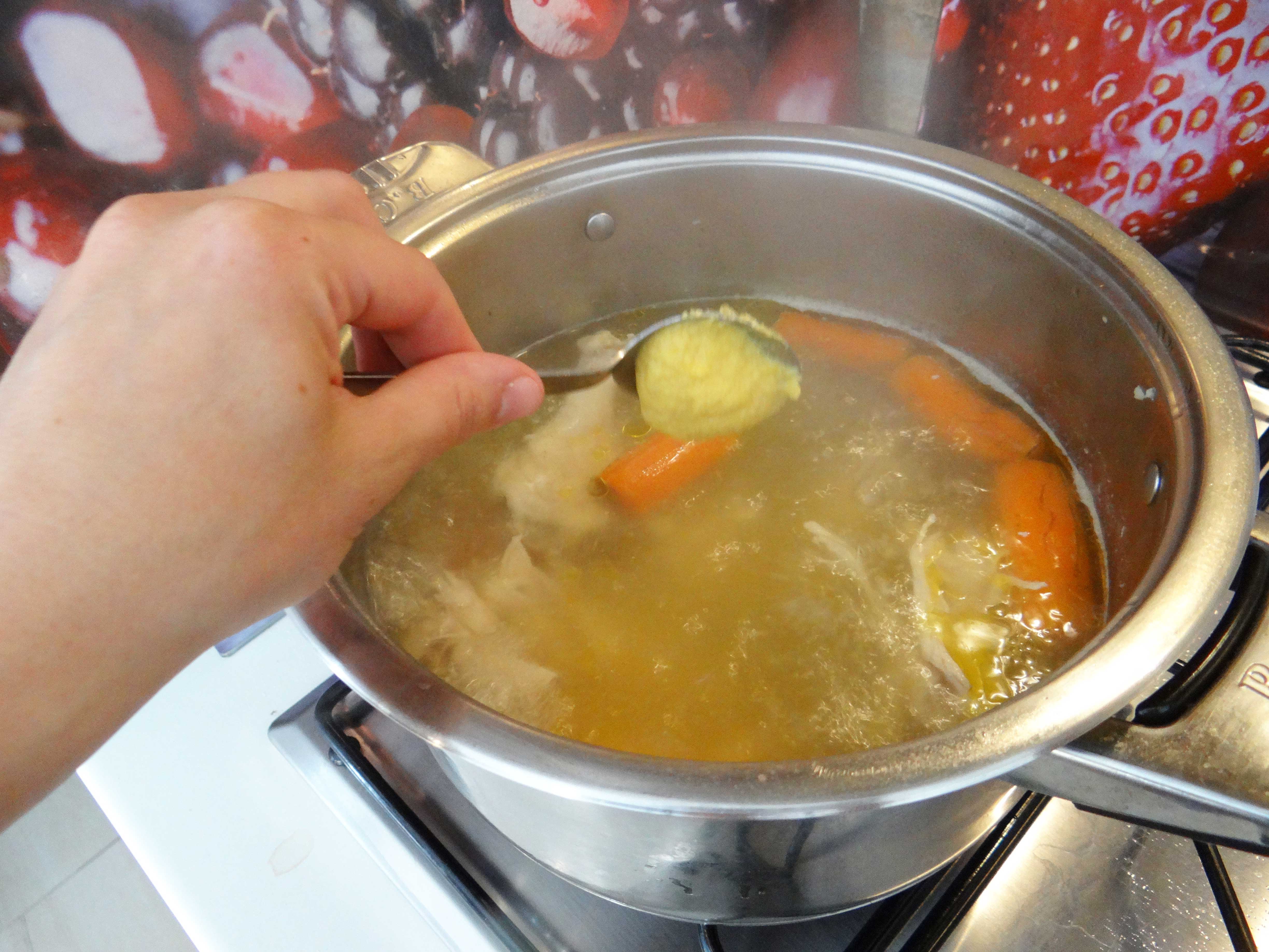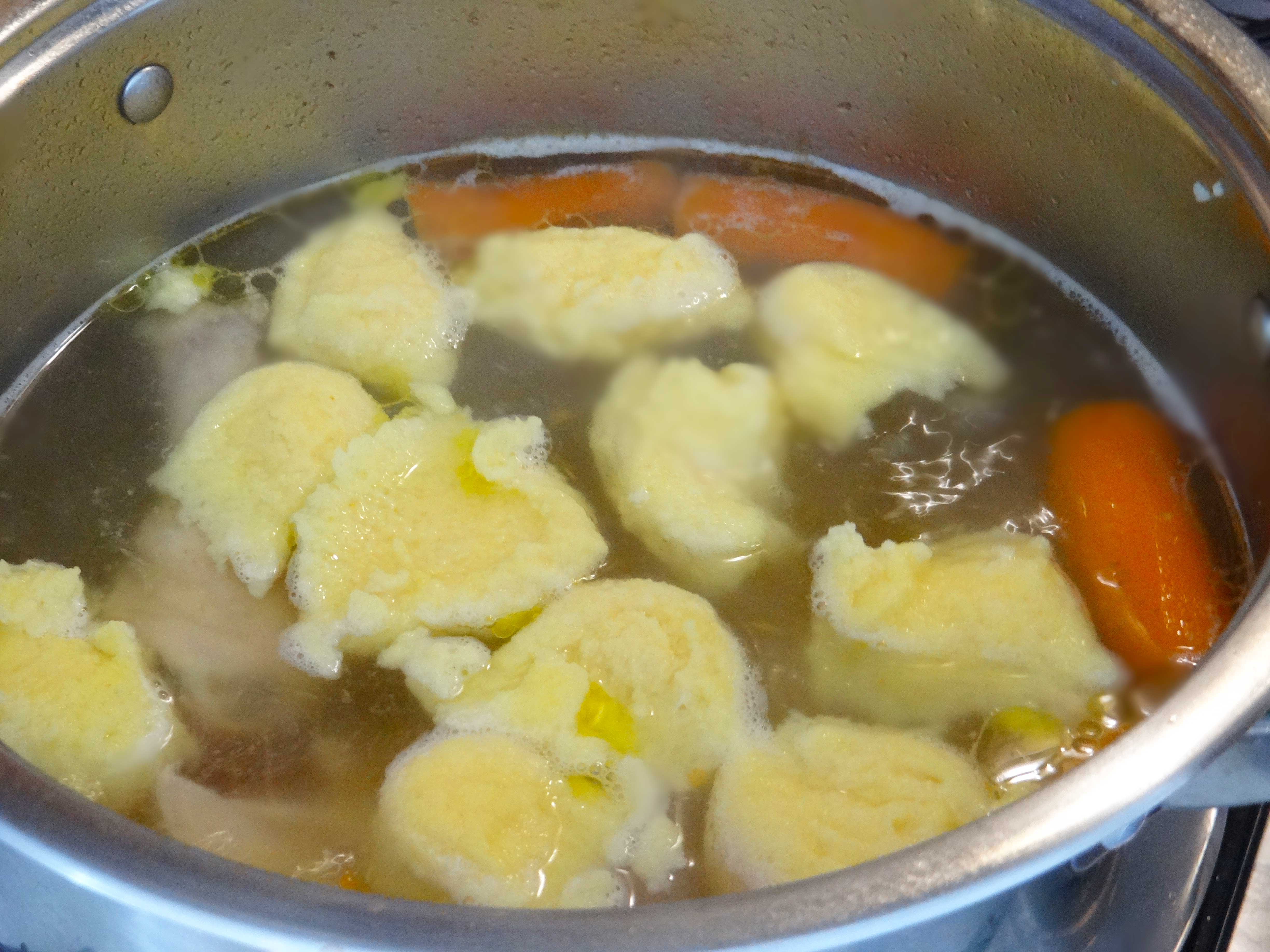 9. Punem inapoi carnea in oala. Daca este nevoie mai punem apa si sare. Cand supa este aproape de punctul de fierbere (nu trebuie sa clocoteasca), punem galustele cu ajutorul unei linguri, care se introduce in apa rece inainte de fiecare galusca formata(pentru a se desprinde mai usor galusca de lingura).