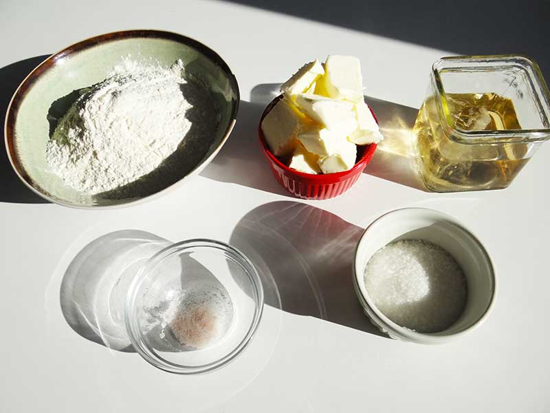 1. În primul rând trebuie să pregătim aluatul. Într-un bol înalt punem făina împreună cu zahărul și sarea. Apoi adăugăm untul pe care îl încorporăm cu vârful degetelor. Trebuie să obținem un amestec care seamănă cu niște firimituri. În mijlocul acestui aluat facem o adâncitură în care punem 2-3 linguri din amestecul de apă cu oțet.