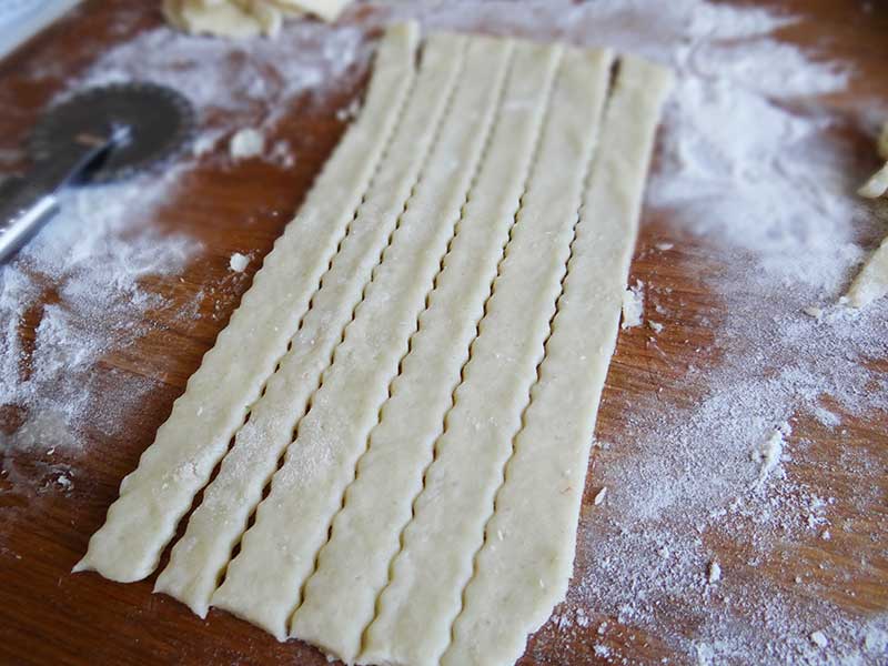2. După 3 ore scoatem aluatul din frigider și îl lăsăm 10 minute la temperatura camerei. Luăm 1/3 din aluat și întindem o foaie în formă de dreptunghi. Din această foaie tăiem fâșii subțiri pe care le așezăm pe o farfurie. Vom avea nevoie de 12-13 fâșii.
