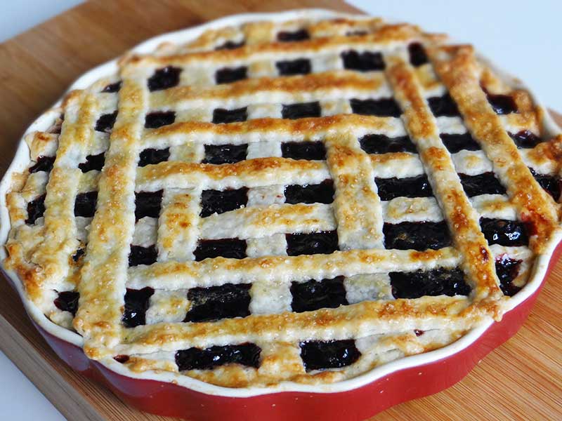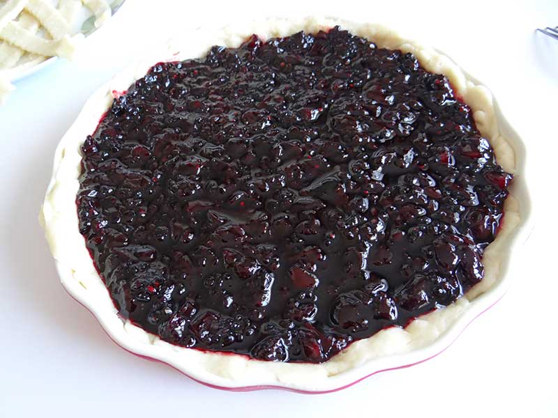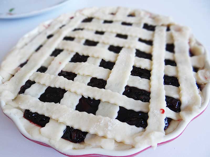 7. Asamblarea tartei. Înțepăm aluatul, din loc în loc, cu o furculiță. Punem umplutura și apoi așezăm fâșiile de aluat.