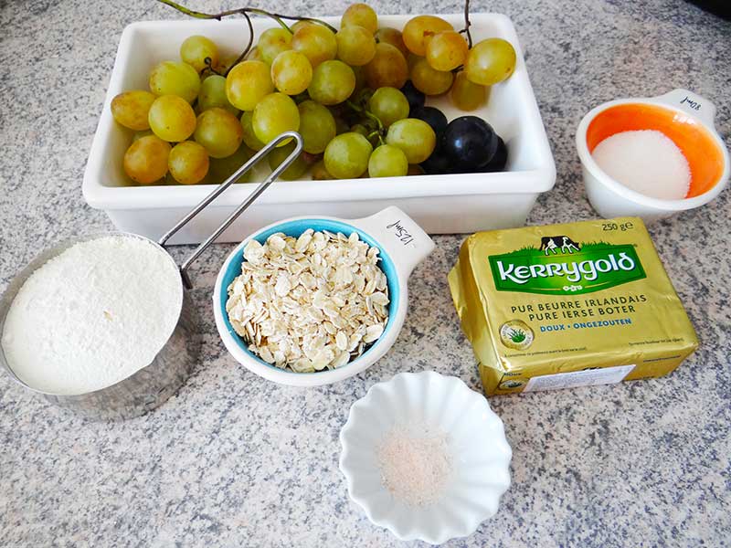 6. Lăsăm crusta la răcit după care o umplem cu cremă iar deasupra așezăm jumătăți de struguri. În cazul în care aveți struguri cu sâmburi trebuie să-i scoateți. Peste struguri presărăm puțin zahăr pudră.