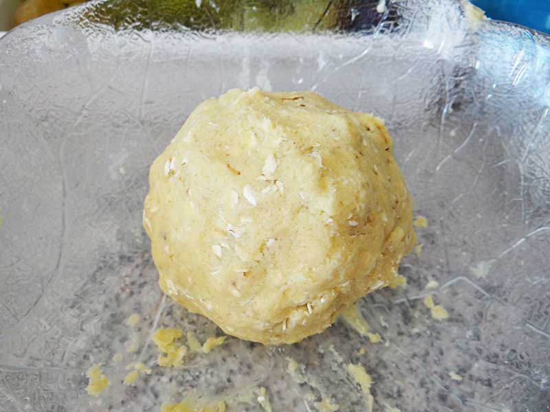 4. Pentru aluat preâncălzim cuptorul la 200 grade C. Combinăm făina cu sarea, zahărul și untul tăiat în cubulețe. Cu ajutorul degetelor înorporăm untul în făină după care adăugăm 2 linguri de apă rece și fulgii de ovăz. Aluatul astfel obținut îl vom pune într-o formă de copt cu diametrul de 20cm. Ideal ar fi să folosiți o formă cu fundul detașabil dar în cazul în care aveți, ca și mine, o forma normală, vă recomand să decupați un disc din hârtie de copt și să-l așezați pe fundul acesteia.