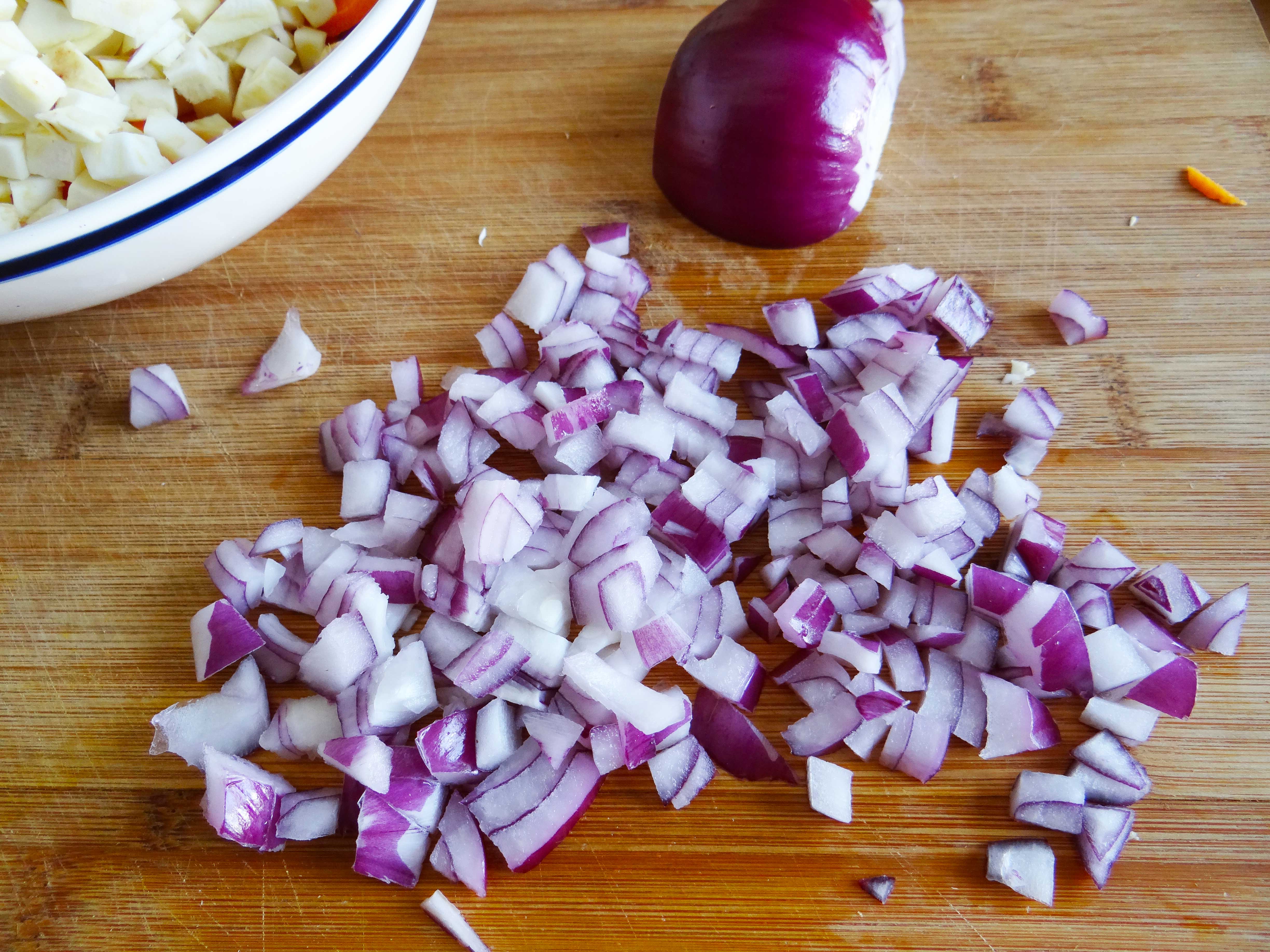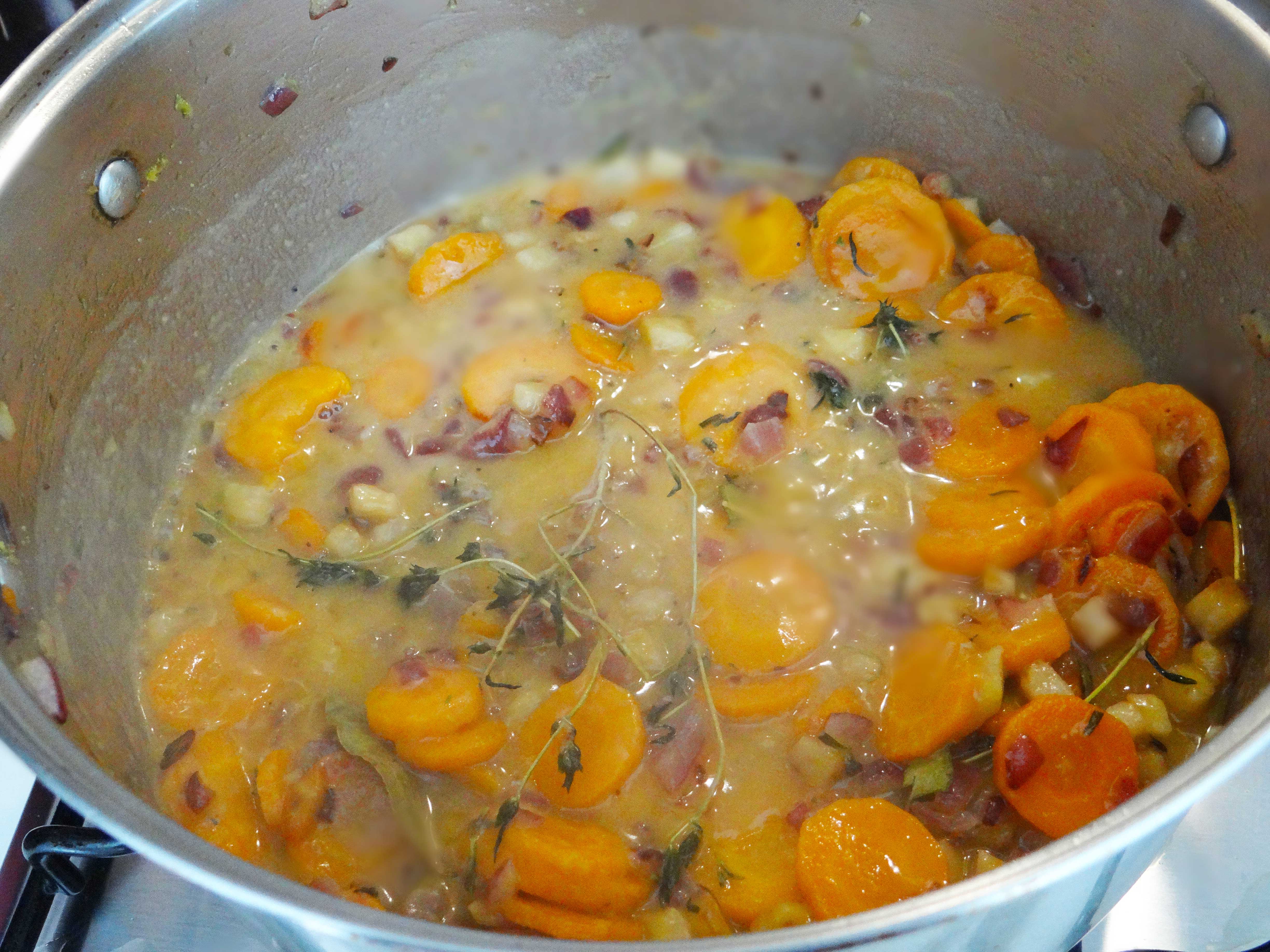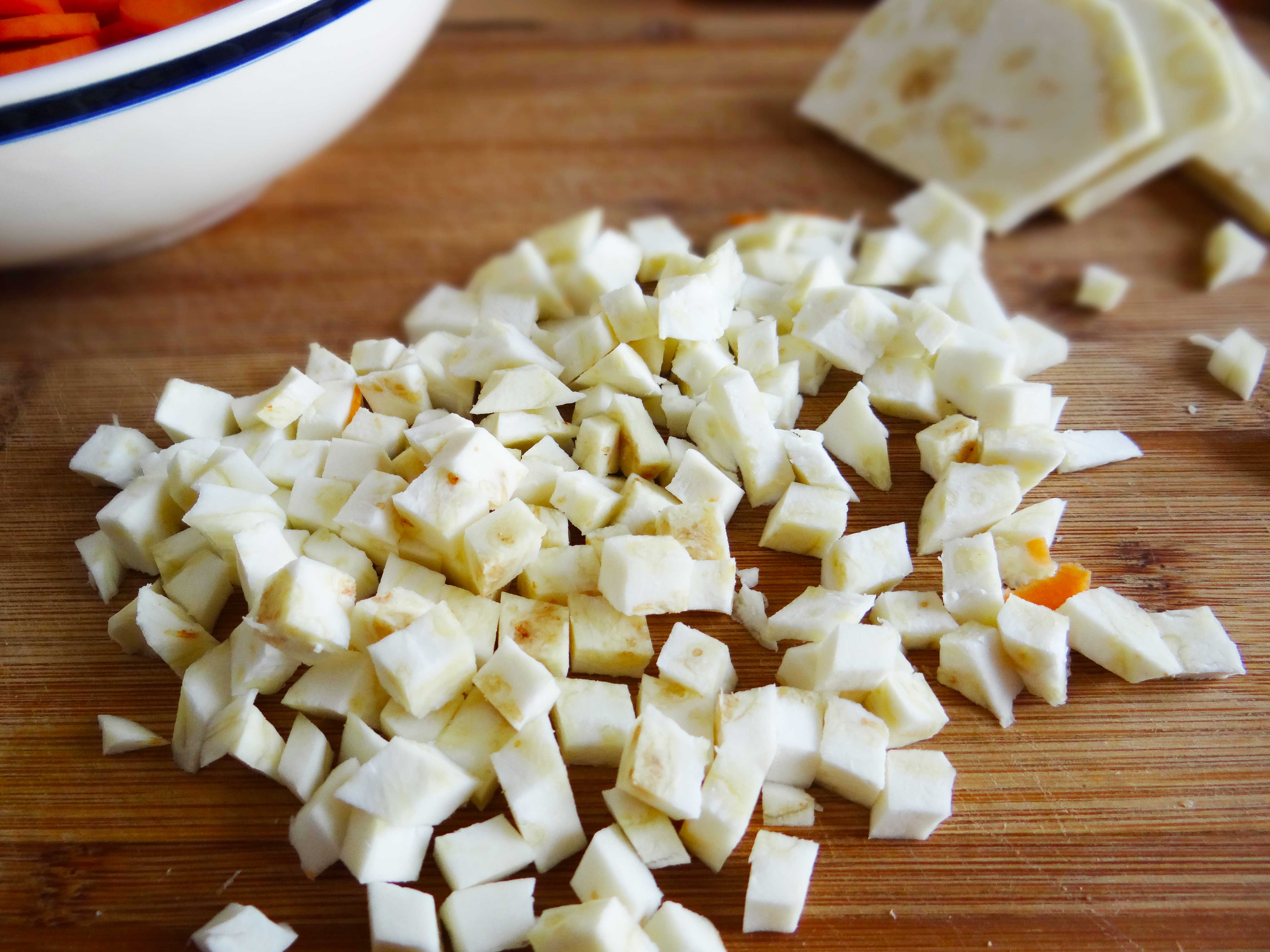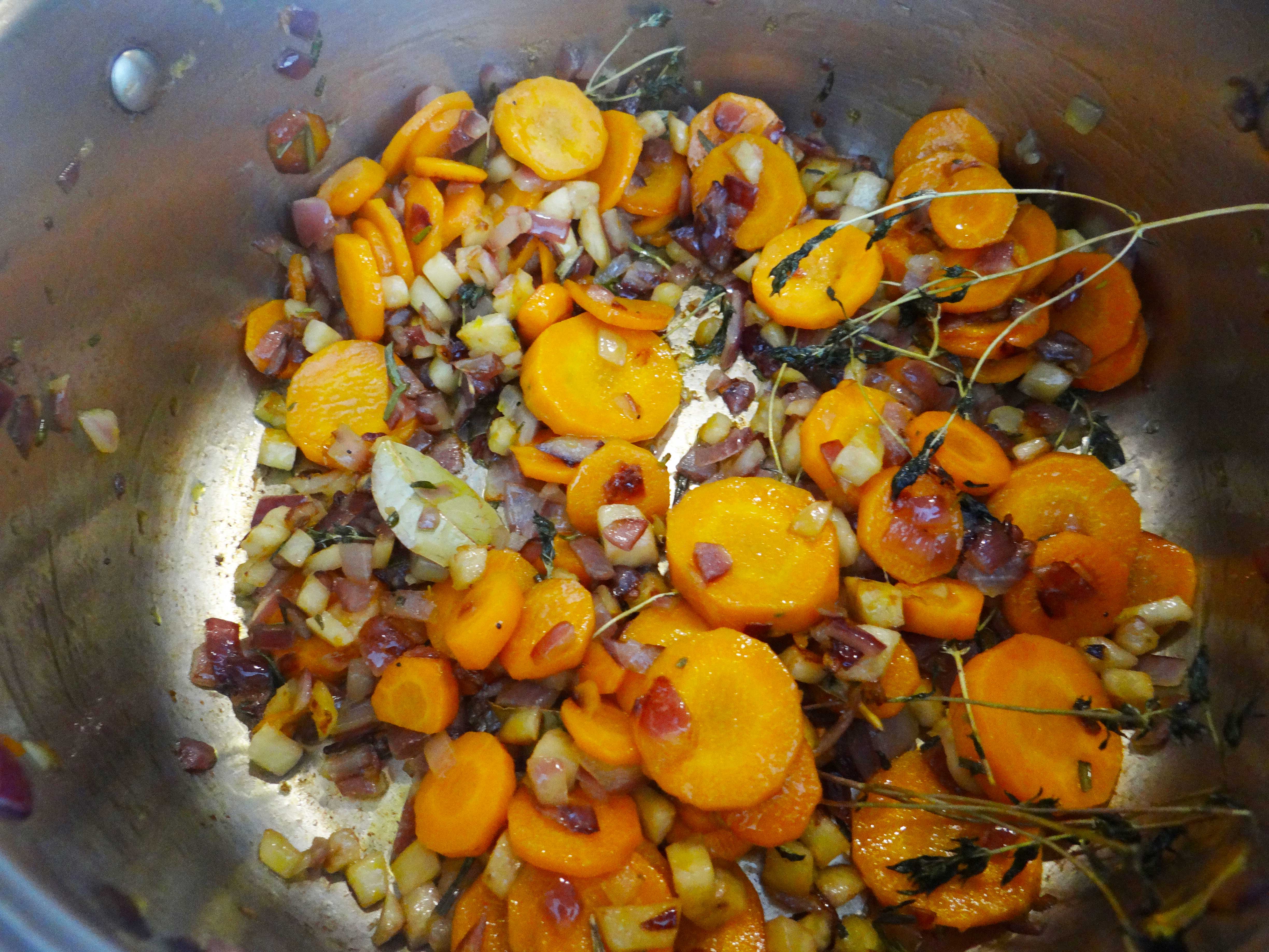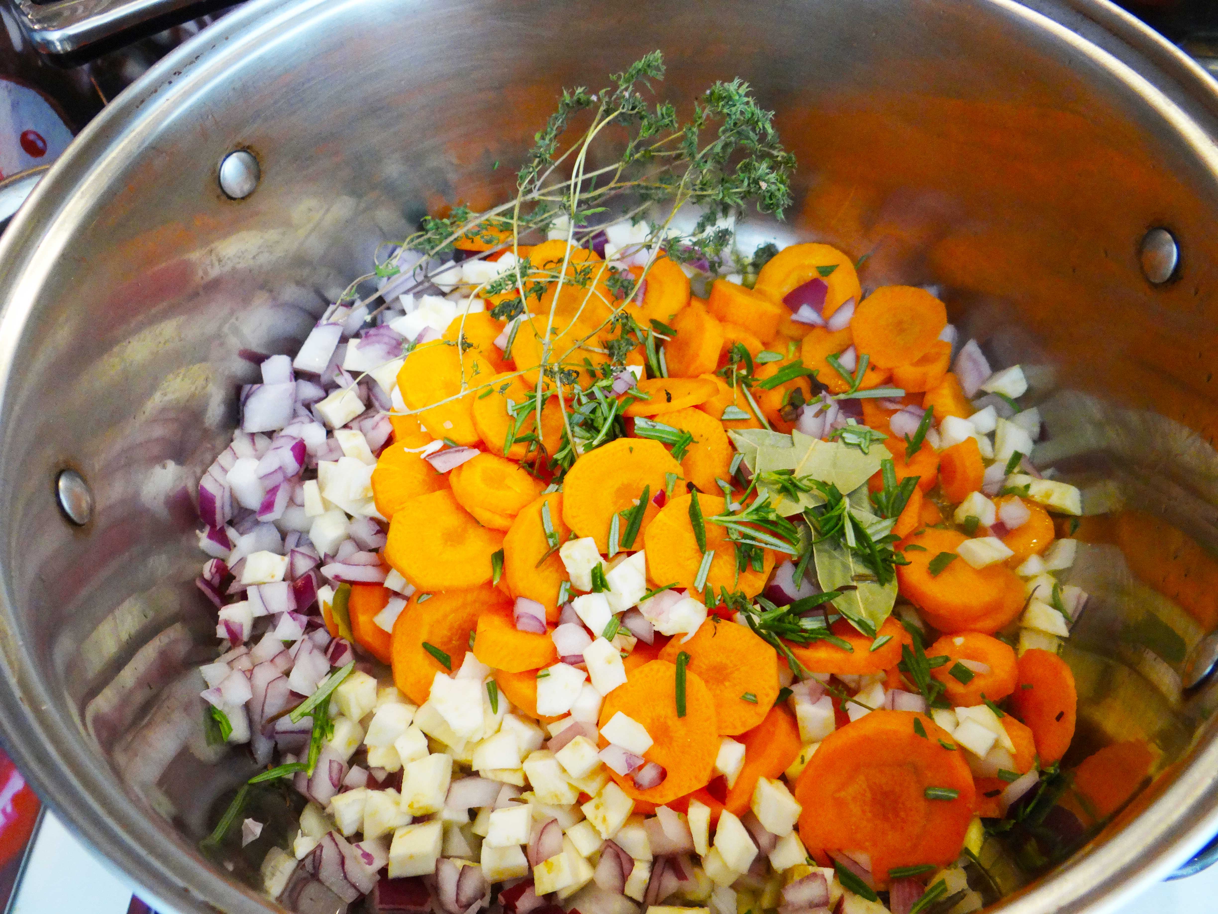 5. Punem 4 linguri de ulei la încins după care adăugăm legumele împreună cu rozmarinul, cimbrul și frunzele de dafin. Le călim 20 de minute până când acestea devin moi și se caramelizează.
