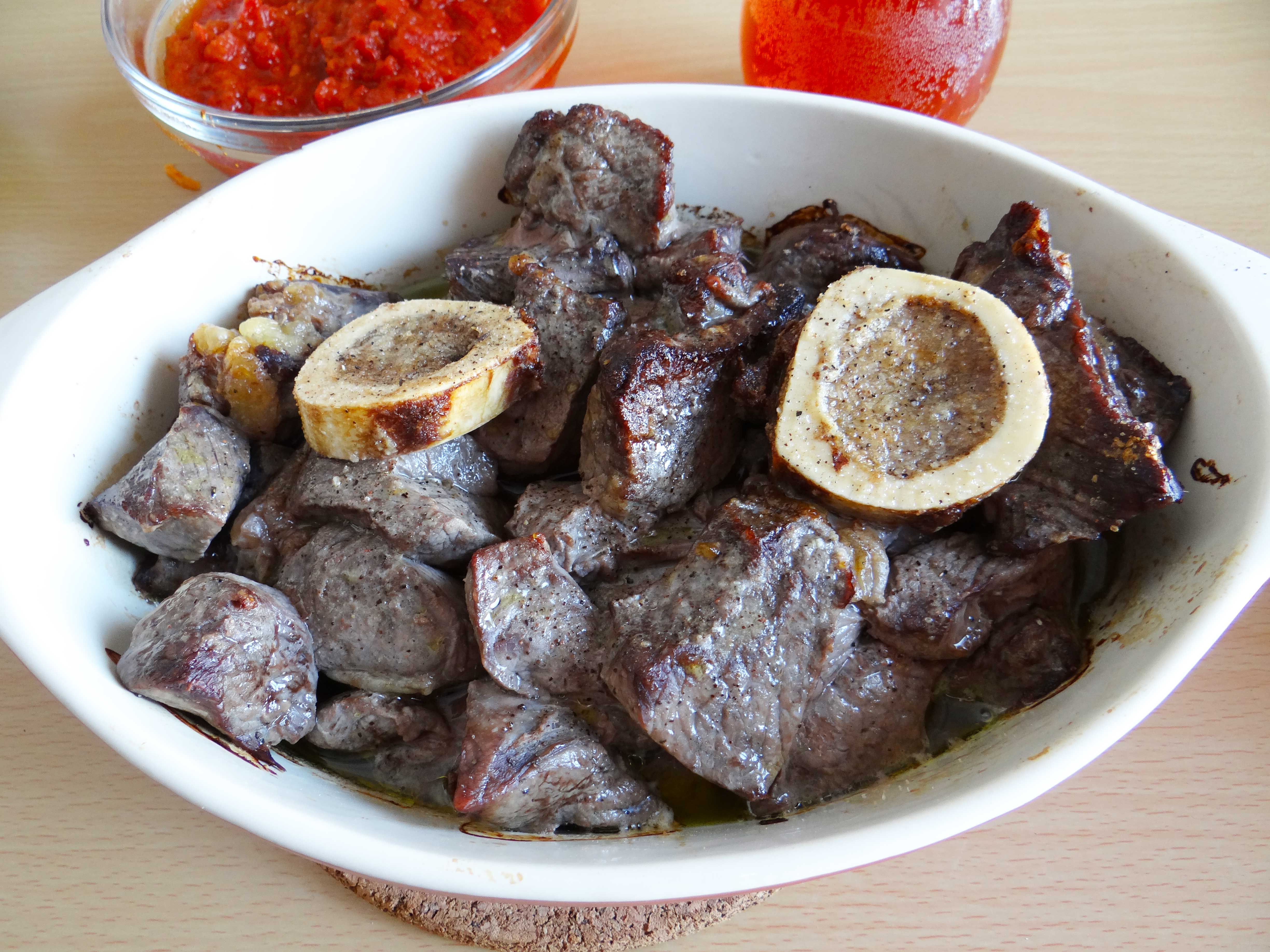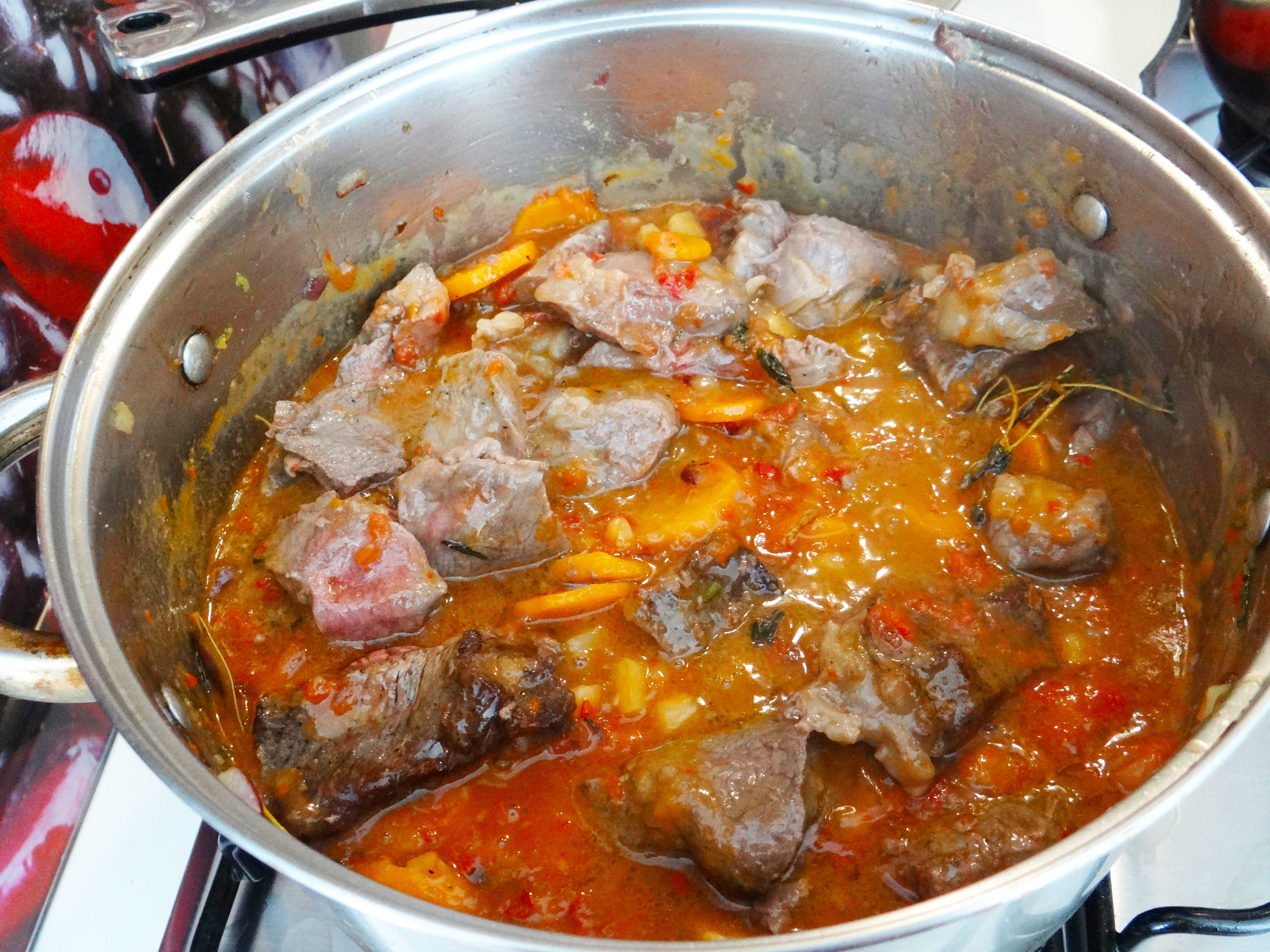 7. Adăugăm apa cât să acopere carnea, lăsăm cratița pe foc până când începe să fiarbă tot amestecul după care o dăm la cuptor pentru 4-5 ore.