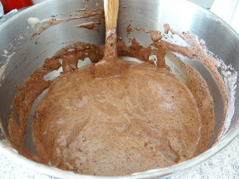3. Separat cernem făina cu cacaoa după care le încorporăm în ouă treptat, cu ajutorul unei linguri, prin mișcări ușoare de jos în sus. După ce am adăugat tot amestecul de făină și cacao adăugăm uleiul.