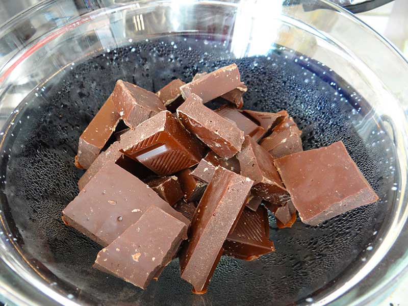 6. Urmează să facem crema. Pentru cremă trebuie în primul rând să punem ciocolata la topit pe baie de apă. Aveți grijă ca vasul în care puneți ciocolata să nu intre în contact direct cu apa fierbinte.