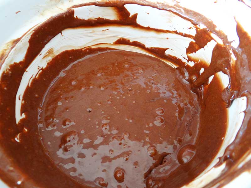 8. După ce luăm ouăle de pe foc le mixăm până își dublează volumul. Adăugăm apoi ciocolata topită și amestecăm foarte bine cu o lingură. Lăsăm amestecul să ajungă la temperatura camerei.