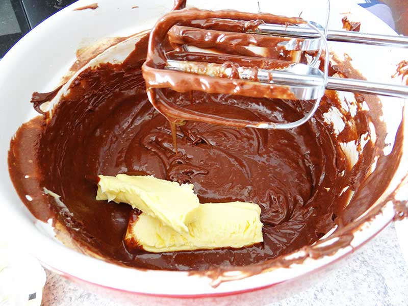 9. După ce amestecul de ciocolată a ajuns la temperatura camerei adăugăm untul moale, puțin câte puțin, și mixăm foarte bine totul. În cazul în care vreți să folosiți mascarpone îl adăugați în acest moment. Tot acum punem și romul.