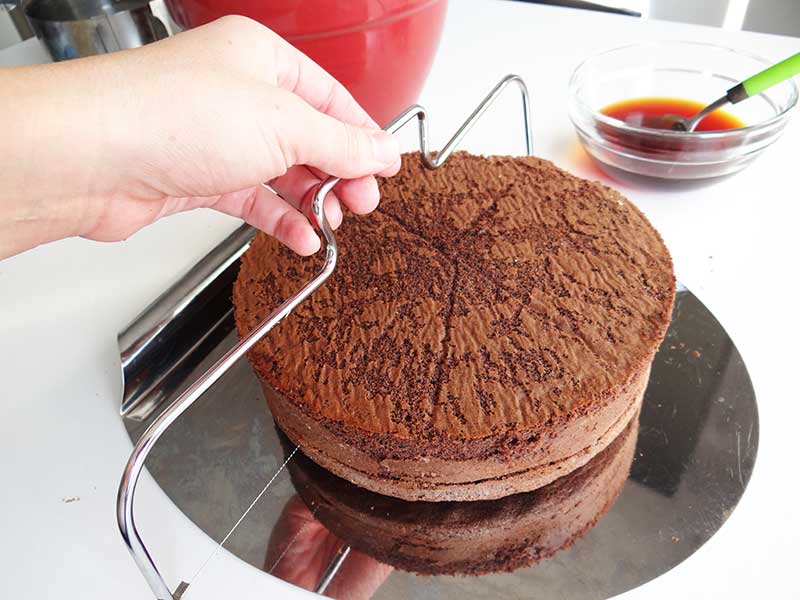 Lăsăm blatul să se răcească complet după care îl tăiem în 3 blaturi. Eu am folosit un instrument special(liră) pentru tăiat tortul dar puteți, la fel de bine, să folosiți și un cuțit cu lamă lungă.
