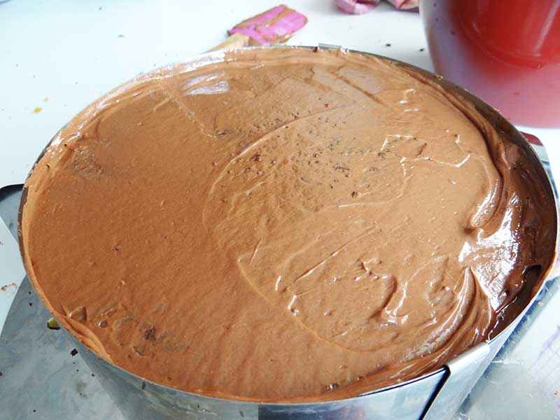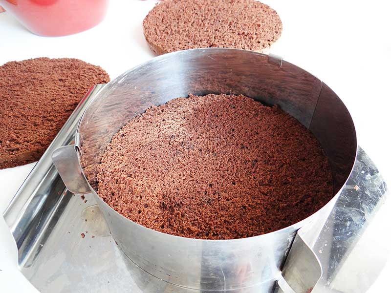 11. Pentru asamblarea tortului am folosit un inel ajustabil special pentru torturi. Așezăm un blat de tort, îl însiropăm bine apoi adăugăm o treime din cremă, urmează iar un blat pe care îl vom însiropa și iar o treime de cremă. La final punem un strat subțire de cremă iar ce rămâne folosim la decor.