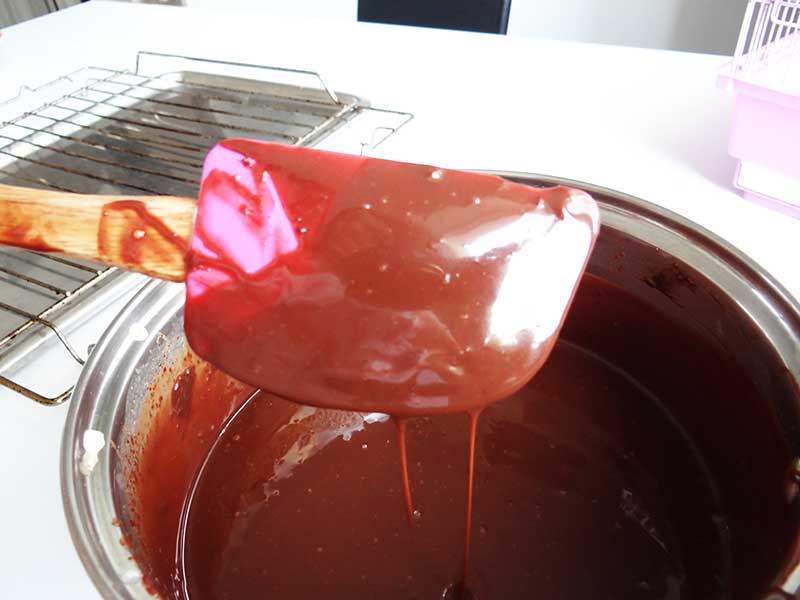Pentru glazură punem pe foc smântâna pentru frișcă. În momentul în care începe să fiarbă o luăm de pe foc și o turnăm peste ciocolata tăiată în bucăți mici. Lăsăm amestecul să stea 10 minute după care amestecăm bine până când ciocolata este topită complet.