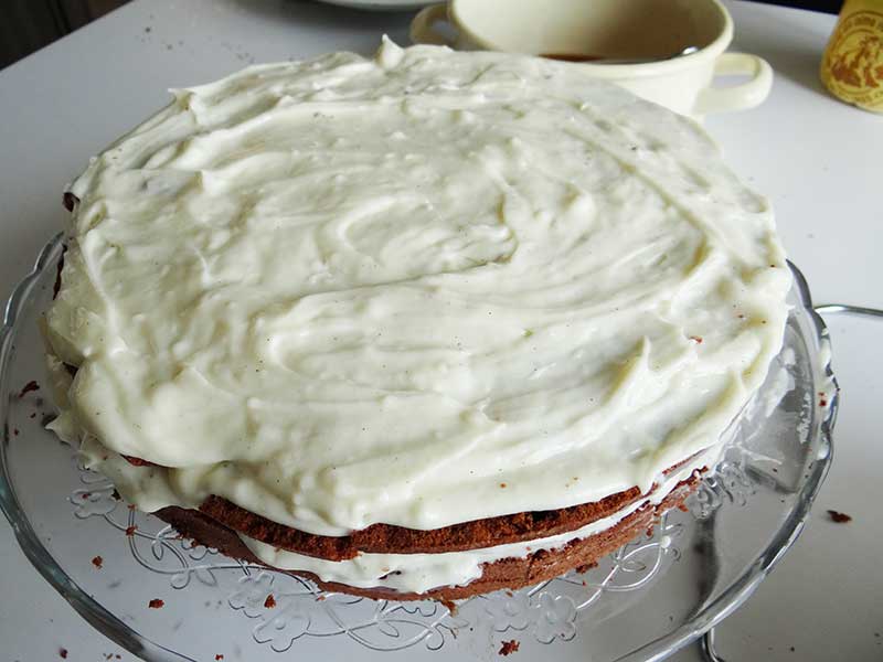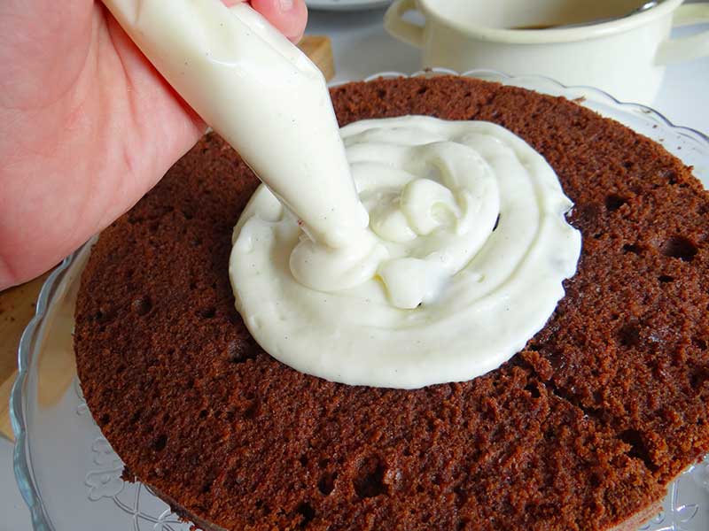 Tăiem blatul în trei, eu am folosit o mandolină specială pentru acest lucru. Însiropăm primul blat, cu ajutorul unui poș punem primul strat de cremă. Peste acesta punem următorul blat și tot așa până când îl punem și pe ultimul. Îmbrăcăm tortul în crema de lapte.