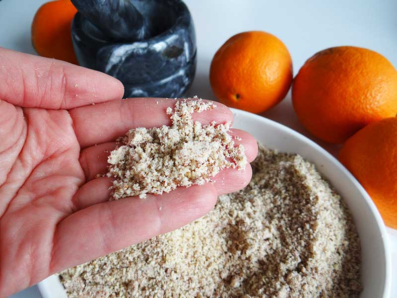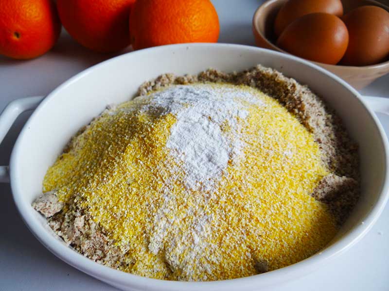 4. Combinăm făina de migdale cu mălaiul, sarea, praful de copt și cardamonul.