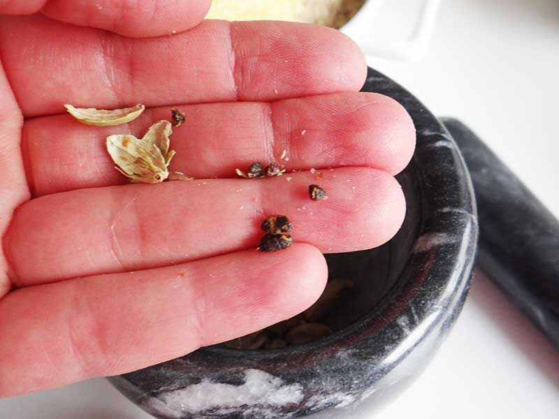 3. Pisăm ușor păstăile de cardamon, îndepărtăm coaja verde după care pisăm semințele negre până când obținem o pudră fină.