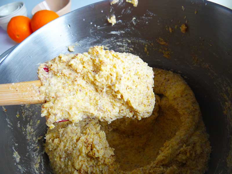 5. Batem untul cu zahărul până când amestecul se deschide la culoare și își dublează volumul. Apoi adăugăm pe rând câte un ou, mixăm totul foarte bine după fiecare ou adăugat. Adăugăm amestecul uscat, 1/2 din coaja de portocală și amestecăm totul cu o lingură.