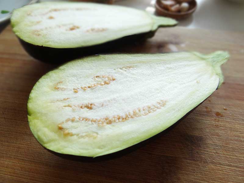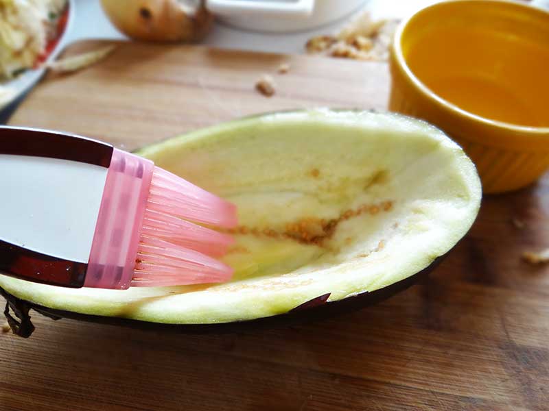 4. Tăiem vinetele pe jumate după care le îndepărtăm miezul cu ajutoul unui cuțit mic. Apoi le ungem cu ulei pentru a împiedica procesul de oxidare.