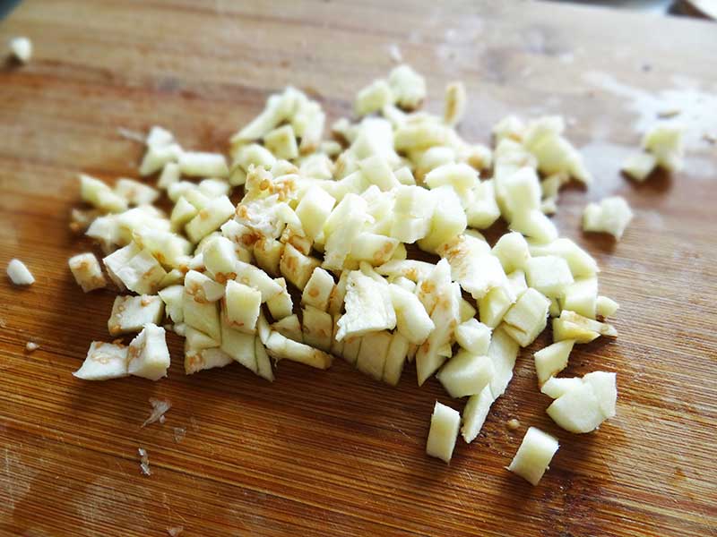 7. Tăiem miezul vinetelor în bucăți mici.
