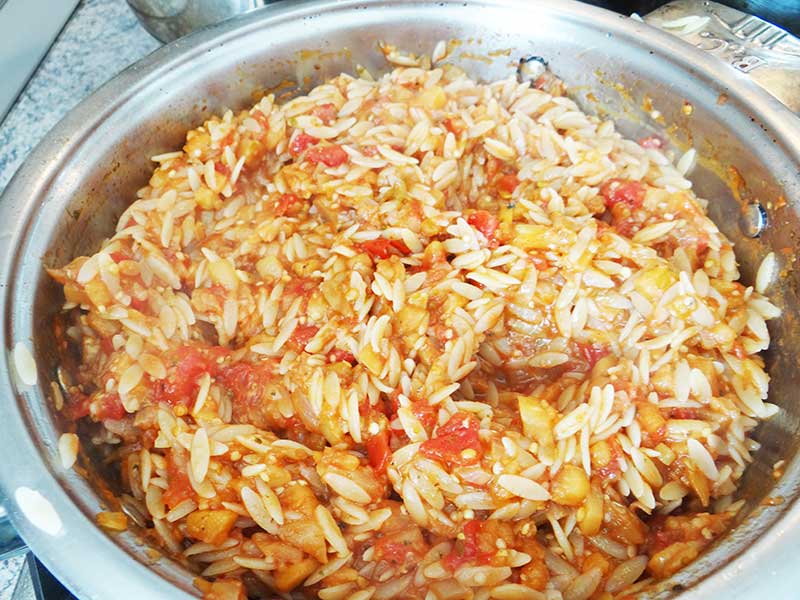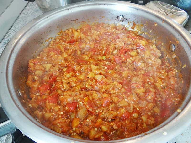 6. Punem uleiul la încins după care călim ceapa pănă devine ușor maronie. Adăugăm usturoiul și îl călim și pe el în jur de 1 minut. Adăugăm miezul vinetelor și le călim în jur de 5 minute. Adăugăm roșiile, asezonăm cu sare, piper, oregano și fierbem totul în jur de 10 minute.