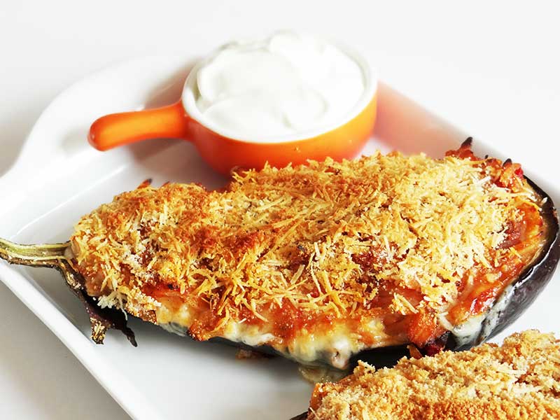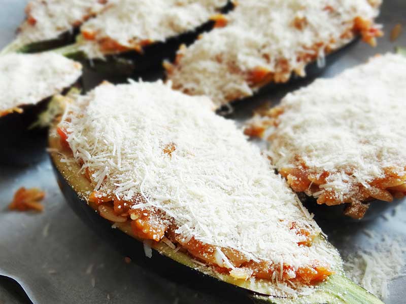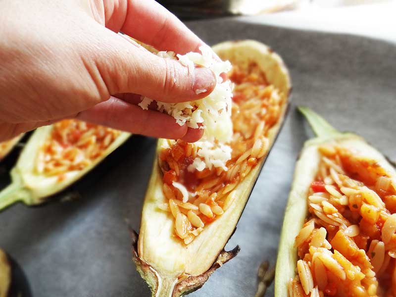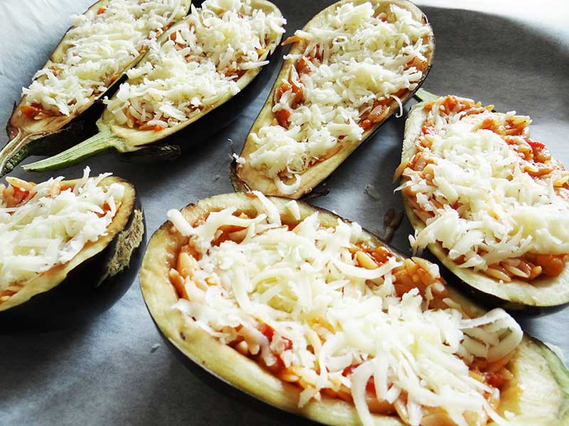 8. așezăm vinetele într-o tavă tapetată cu hârtie de copt. Le umplem pe jumate cu umplutură apoi adăugăm un strat de cașcaval răzuit pe răzătoarea mare.
